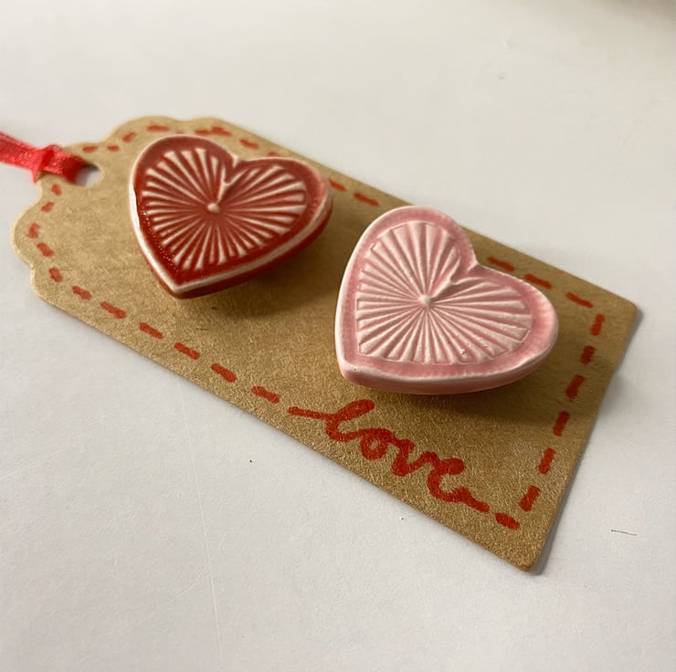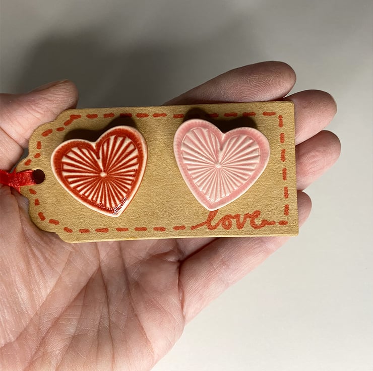 These little heart magnets are made from white earthenware clay and imprinted with pattern. They have been fired twice, once to the bisque stage and then a second firing for the glossy glaze. Each magnet measures 3cm x 3cm height x 5mm thick.