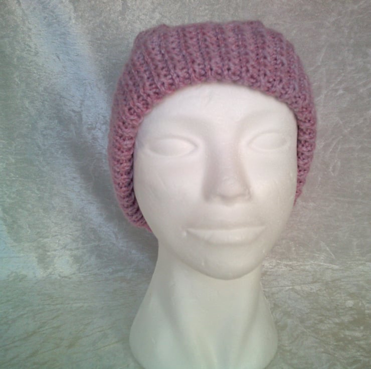 Hand knitted adult hat in Dusky Pink has a chunky cable design and is machine washable on a 40 degree wash.