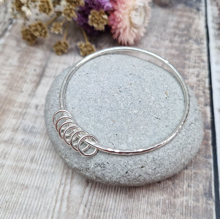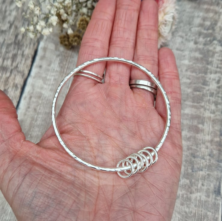 This handmade recycled sterling silver bangle features six delicate silver rings that glide along the hammered surface, adding a playful movement and texture to the design. The subtle hammering on the bangle brings a soft shimmer, beautifully catching the light and showcasing the craftsmanship behind this piece.