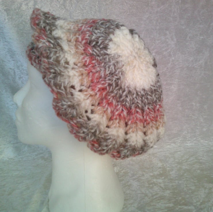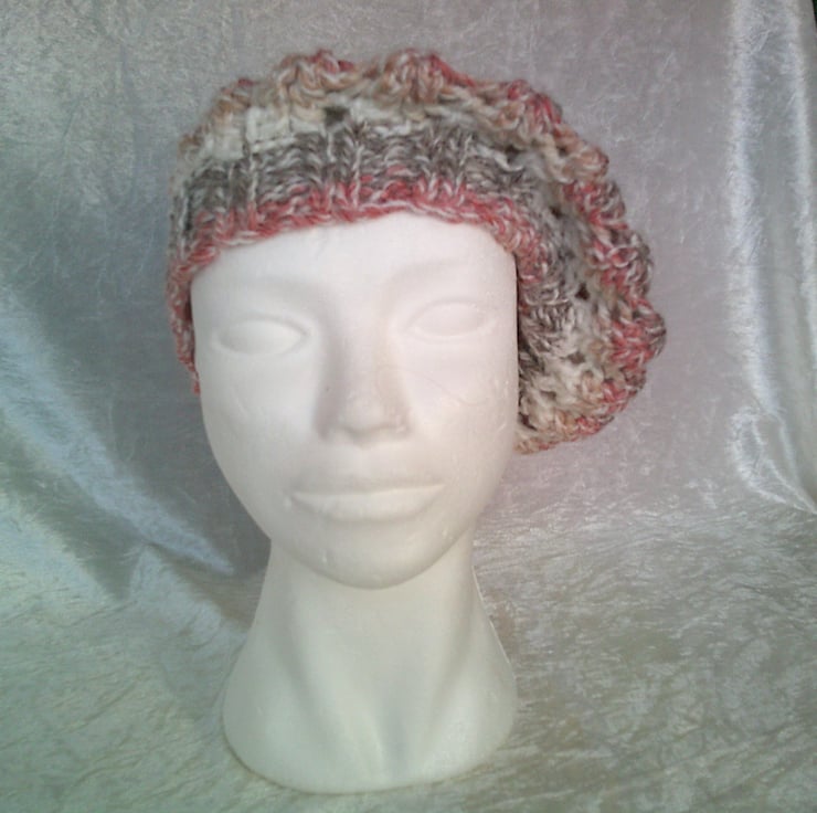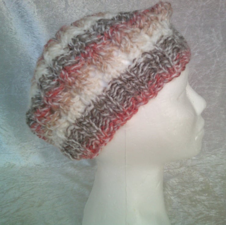 Hand knitted adult beret is made using acrylic chunky yarn in shades of Cream, Brown and rust and is machine washable on a 40 degree wash.
