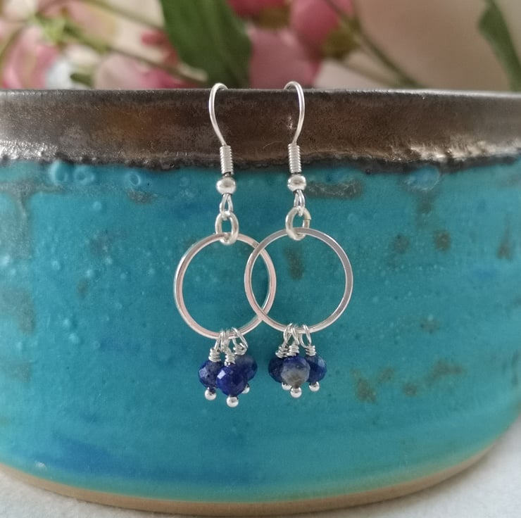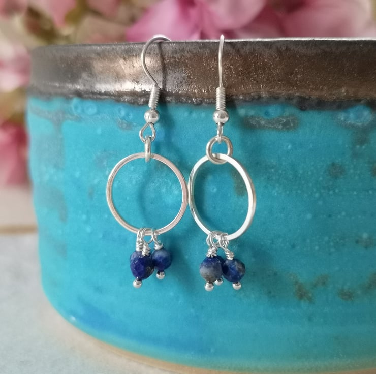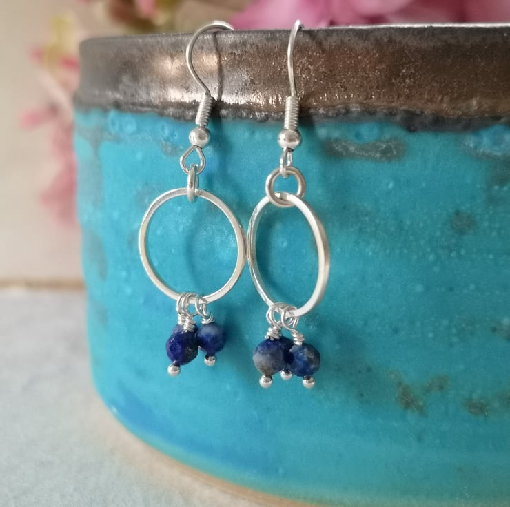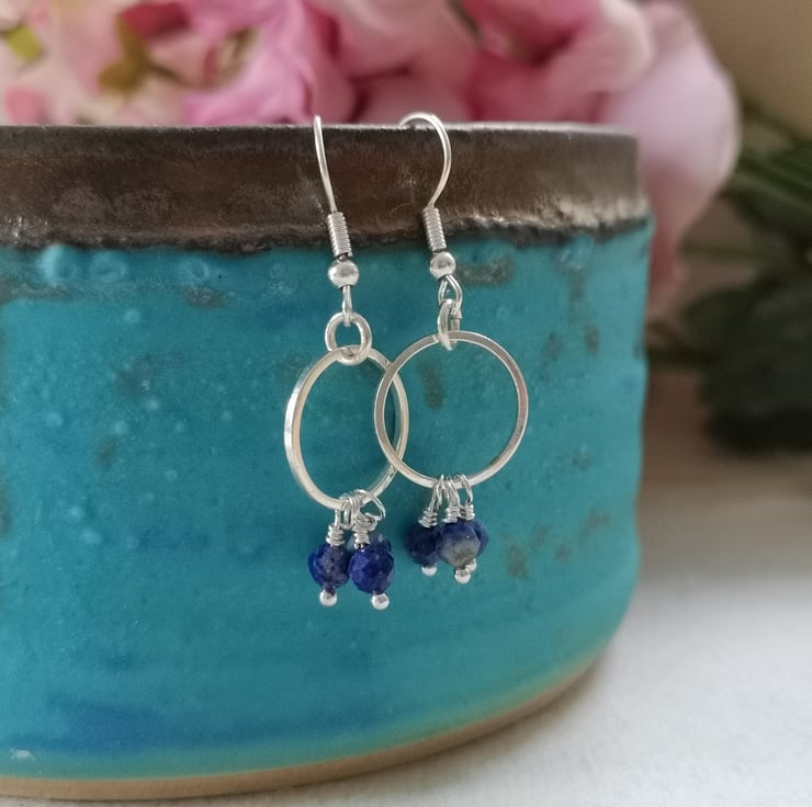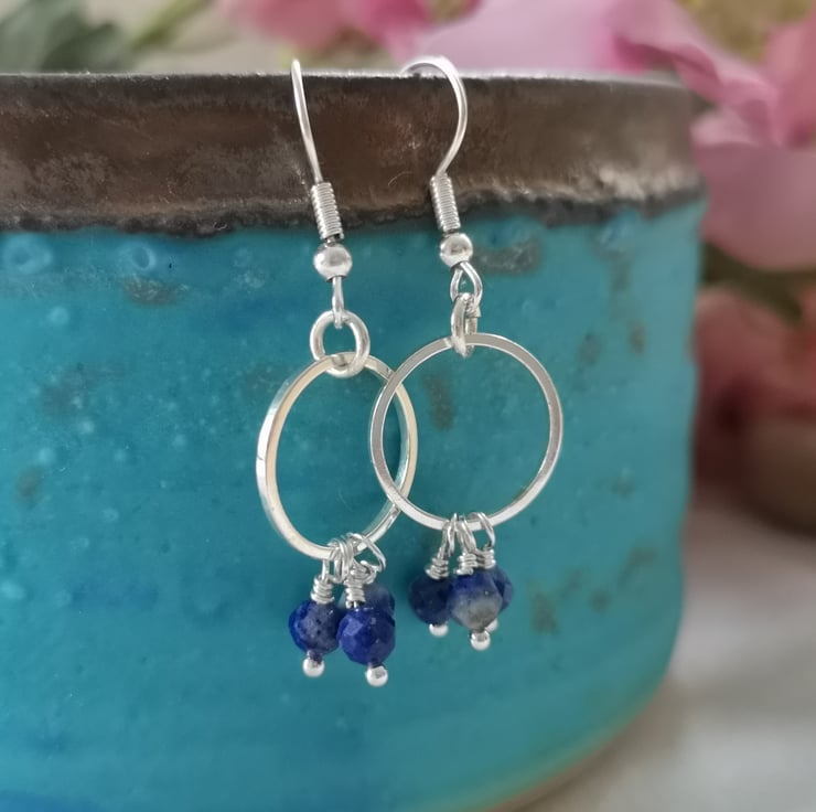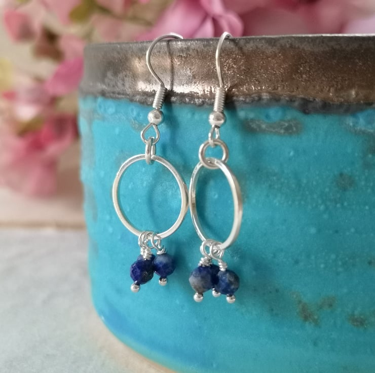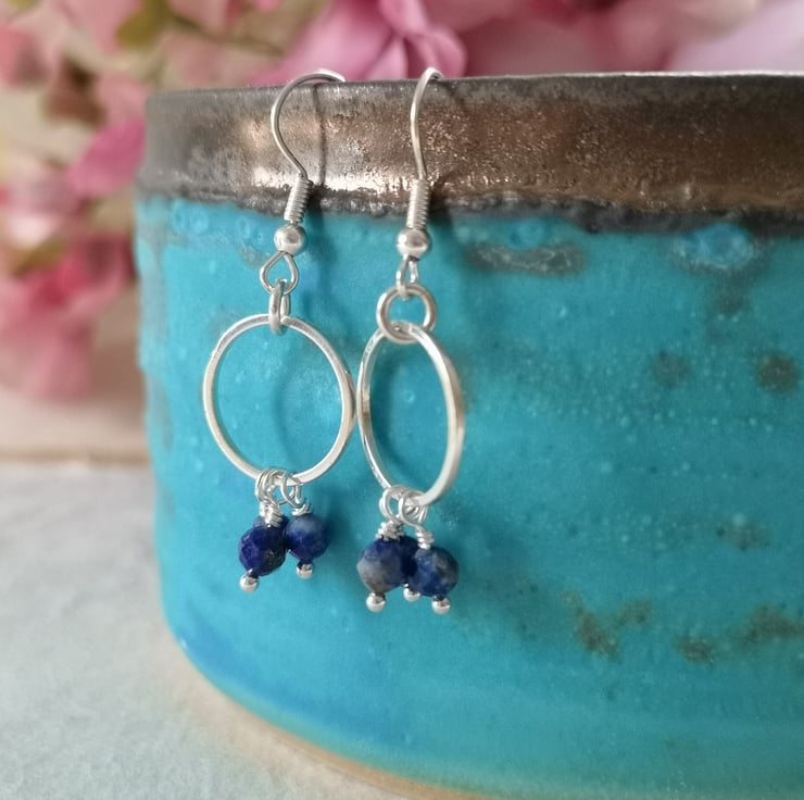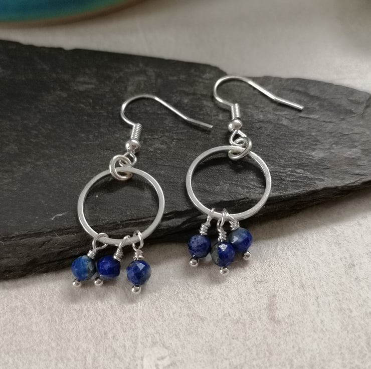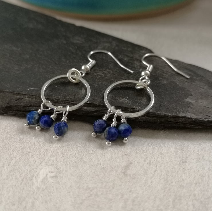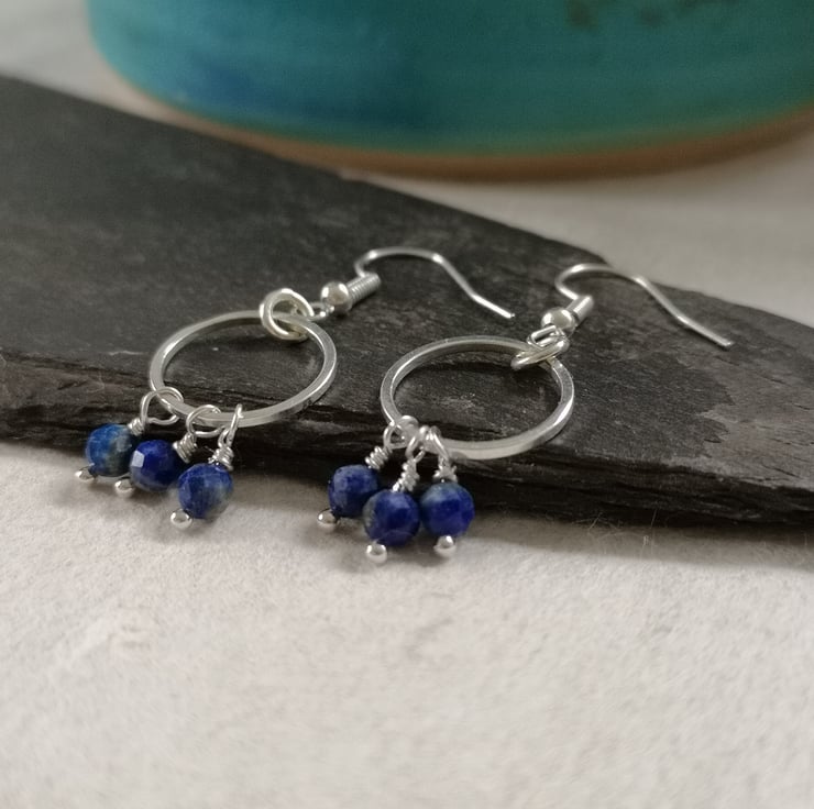 These sweet little earrings feature a trio of lapis lazuli gemstones. The vivid blue beads are faceted to reflect the light when they move. They're attached to a silver plated ring and earwires.