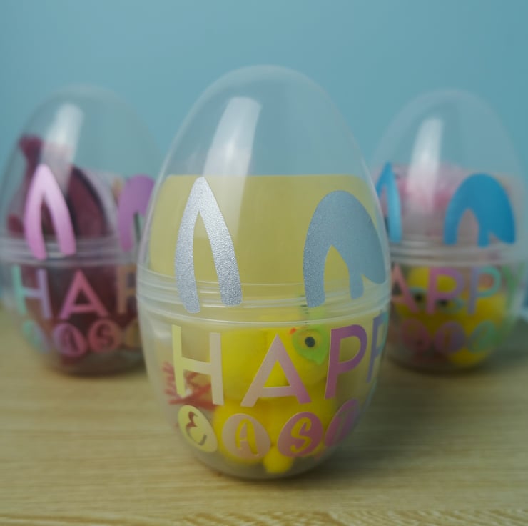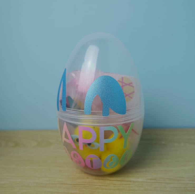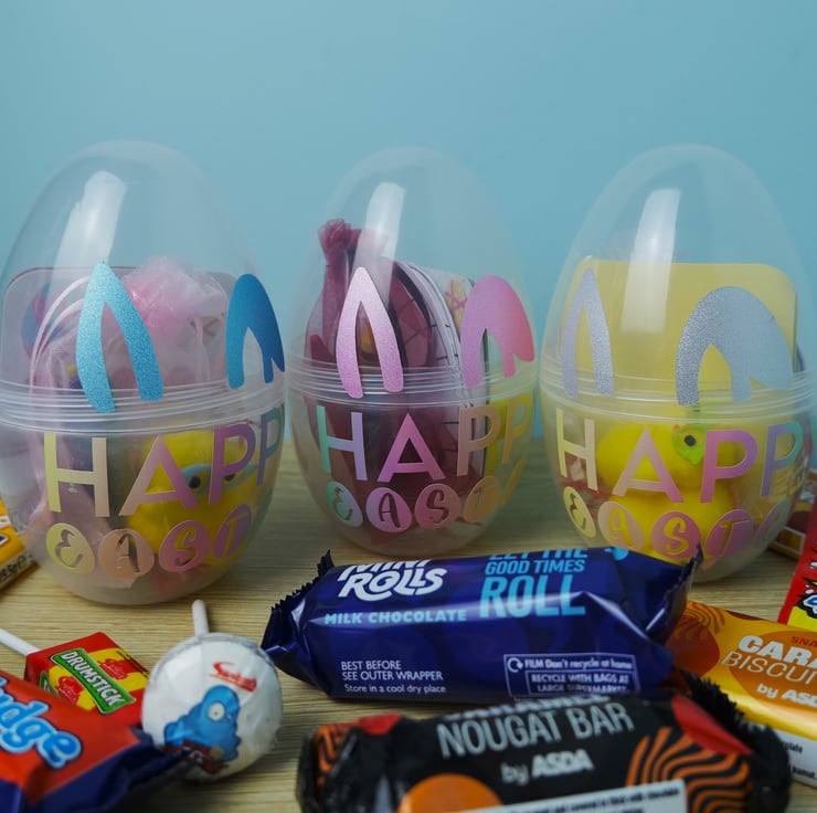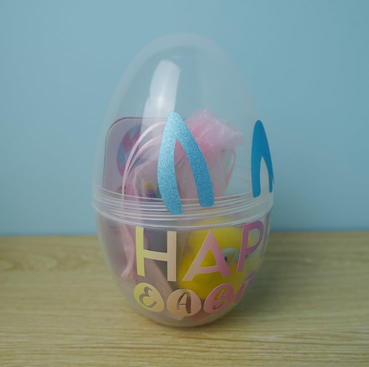 The egg measures 14cm by 9cm and is decorated with rainbow effect Happy Easter vinyl along with glittery bunny ears (colour comes in either silver, blue or pink).