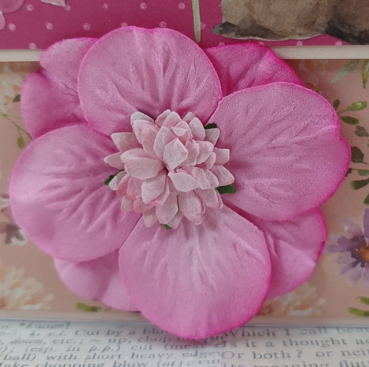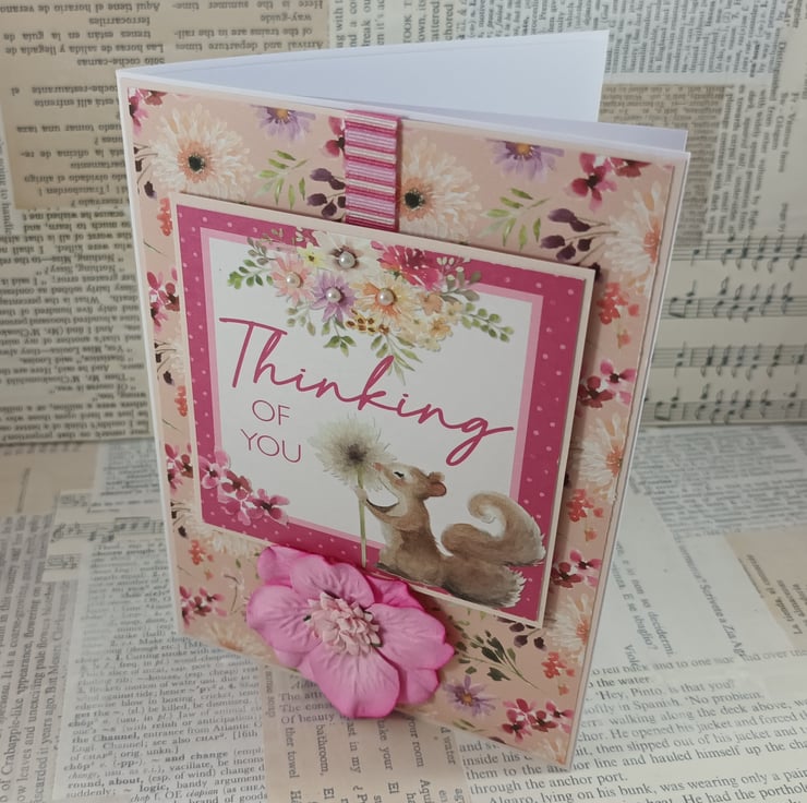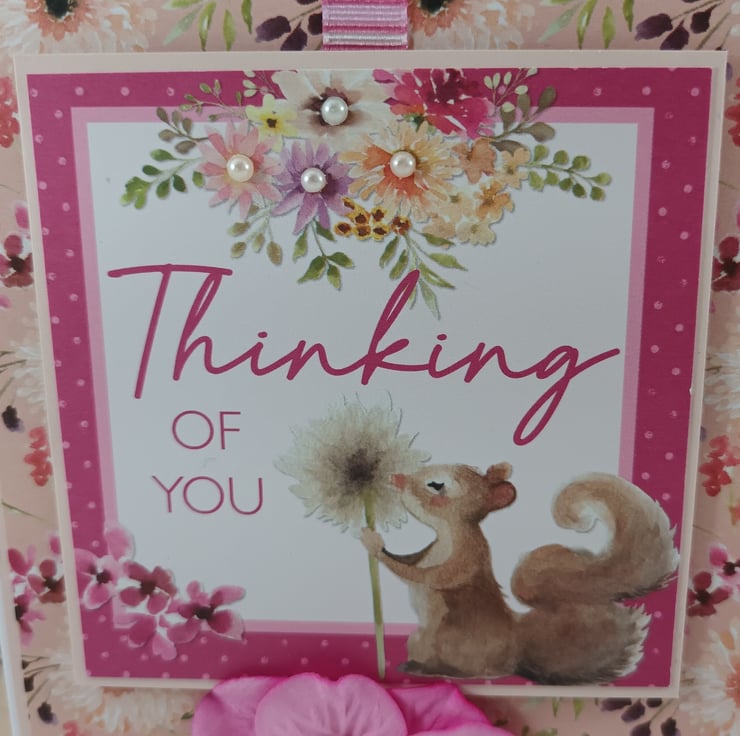 A6 greetings card with the sentiment 'Thinking of You'. The card has a printed topper featuring the sentiment, flowers and a cute squirrel. This has been overlaid onto coordinating background paper and a length of grosgrain ribbon. The card is embellished with pink paper flowers and small pearl gems in the centres of flowers on the topper.