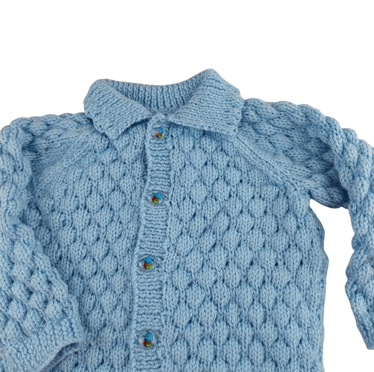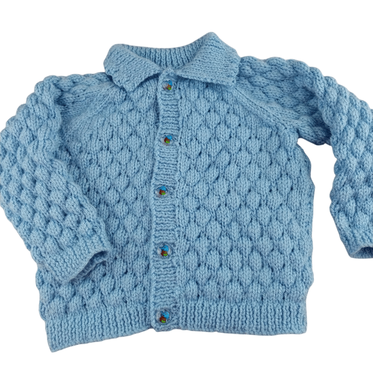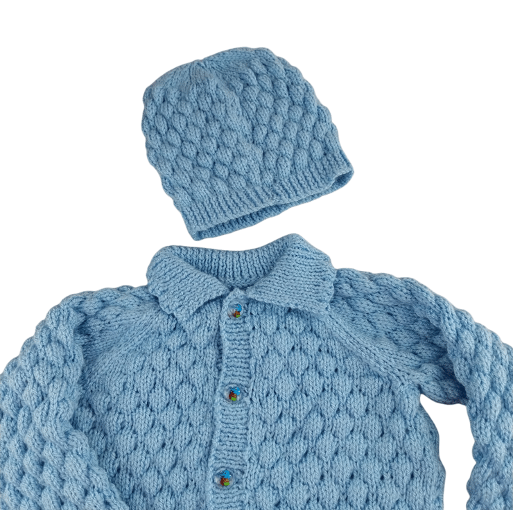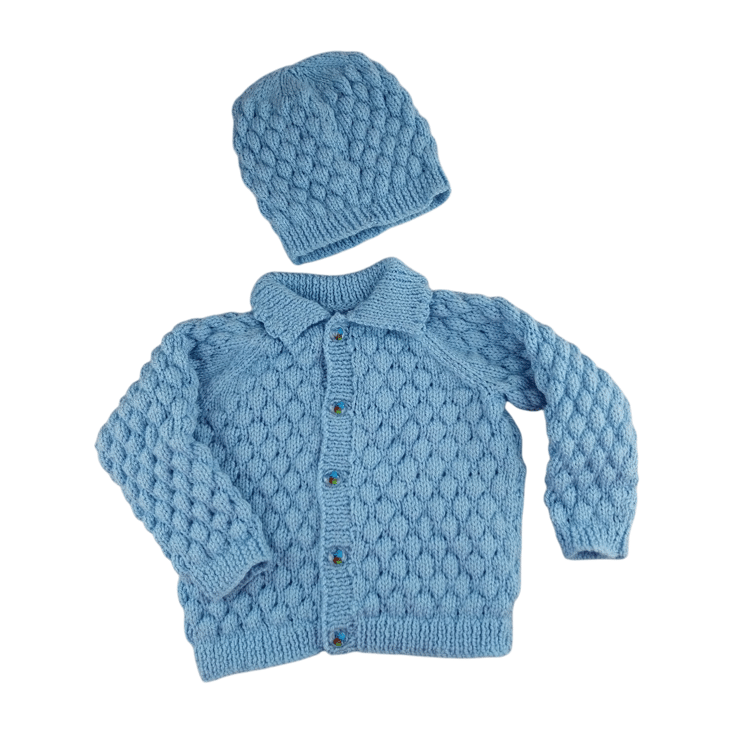 This adorable hand-knitted baby boy gift set includes a light blue cardigan and a matching hat, both designed in a delightful bubble stitch pattern. It’s not just cute—this set is soft, comfy, and perfect for your little one’s adventures!