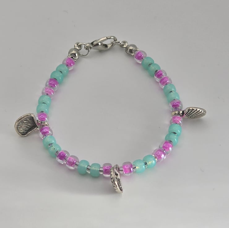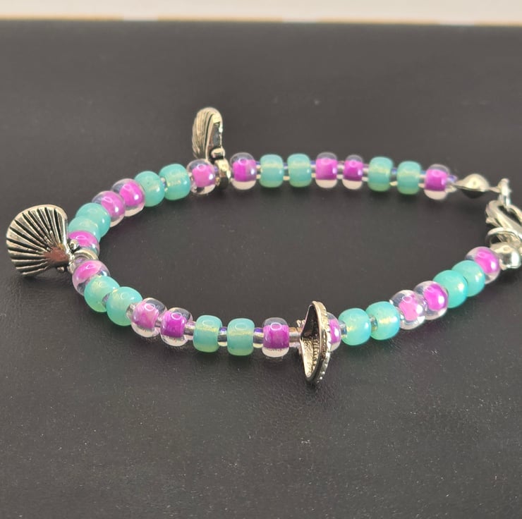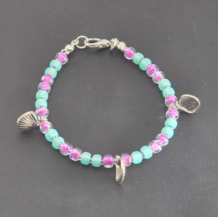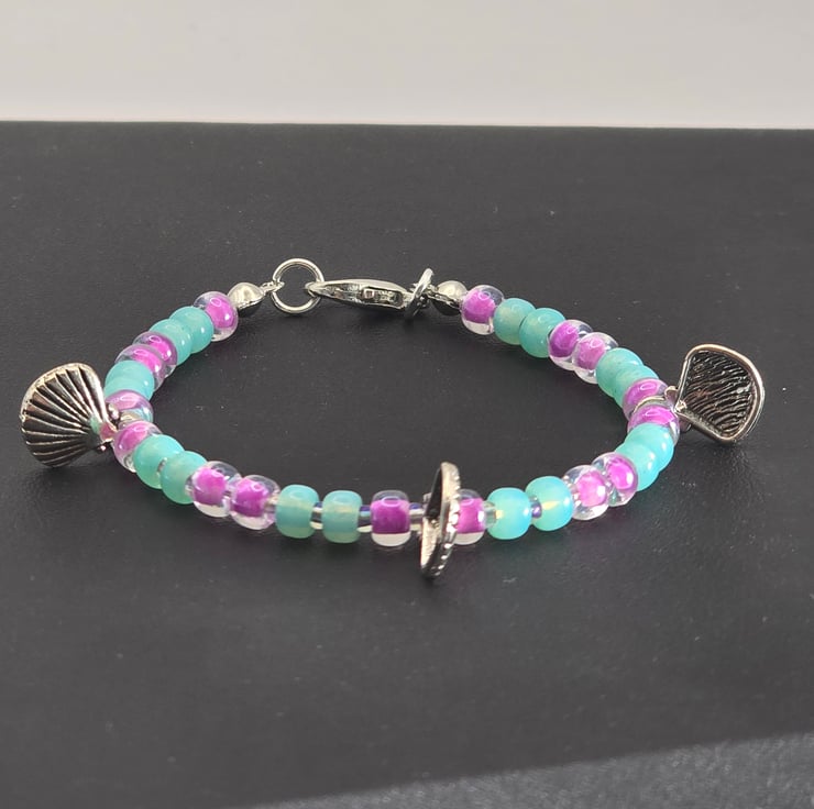 The kids bracelet has been made using Miyuki seed beads in sea green and luminous Plum crazy with 3 silver shell charms. The Plum crazy seed beads are on either side of metal silver charm beads. The beads are on thin beading wire and fastens with a silver clasp.