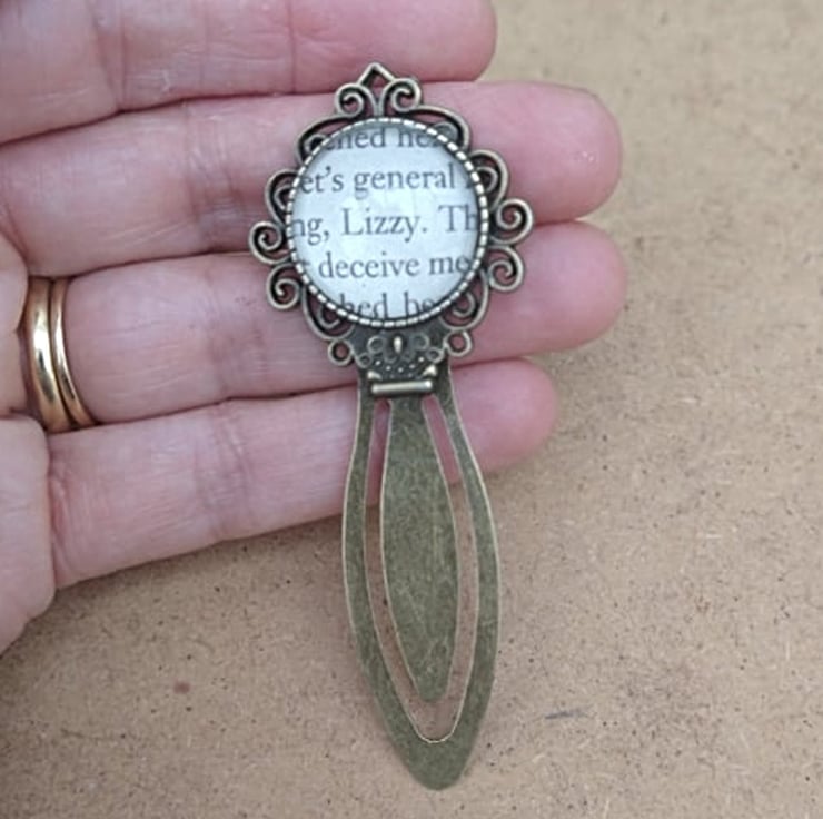 Each bookmark is unique as a different book page is used for each one and cut to fit. I am passionate about upcycling, so never scan in book pages to make my life easier! The text measures 2cm in diameter and is set beneath a glass dome which slightly magnifies the words, into a metal bookmark mount.