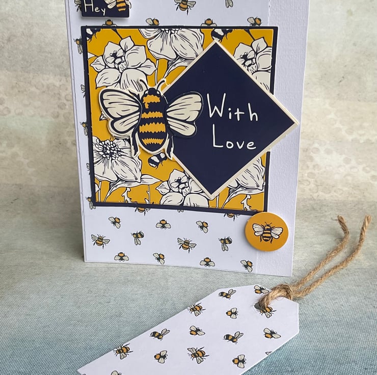 This set of five cards features layered bee patterns on the white card background. Birthday and other greetings have been added in various designs. Each card includes a 3D element. The pack includes a set of five coordinating gift labels.