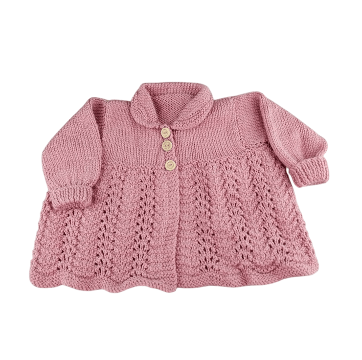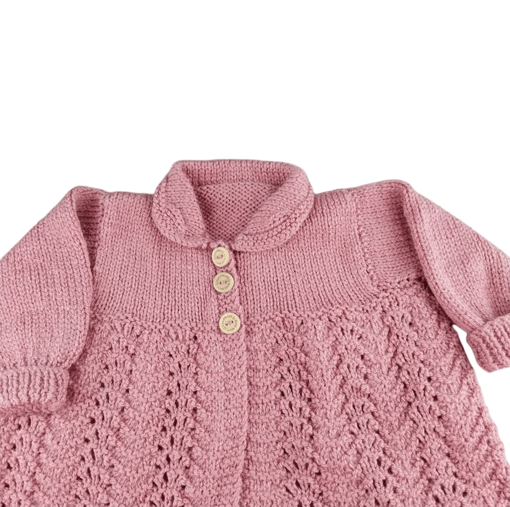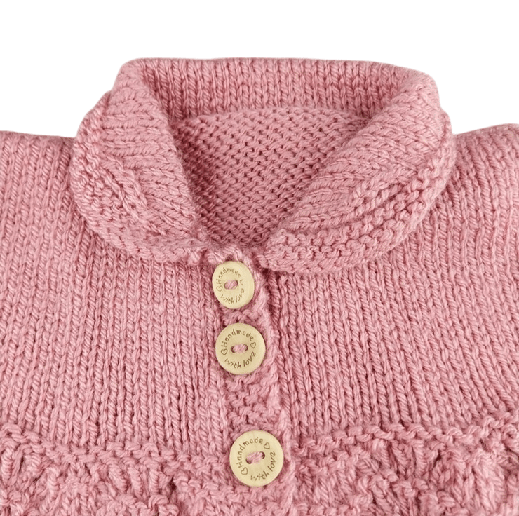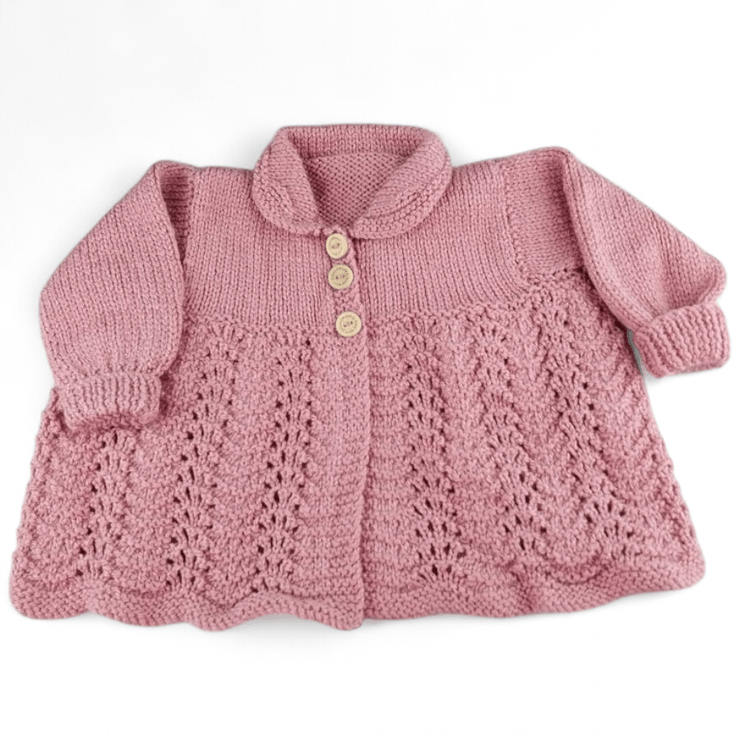 Indulge your little one in a touch of vintage charm with this Hand-Knitted Baby Girls Cardigan, available in a delightful rose pink hue. This stunning piece showcases the intricate old shale stitch pattern from Shetland, adding timeless allure to your baby's wardrobe.
