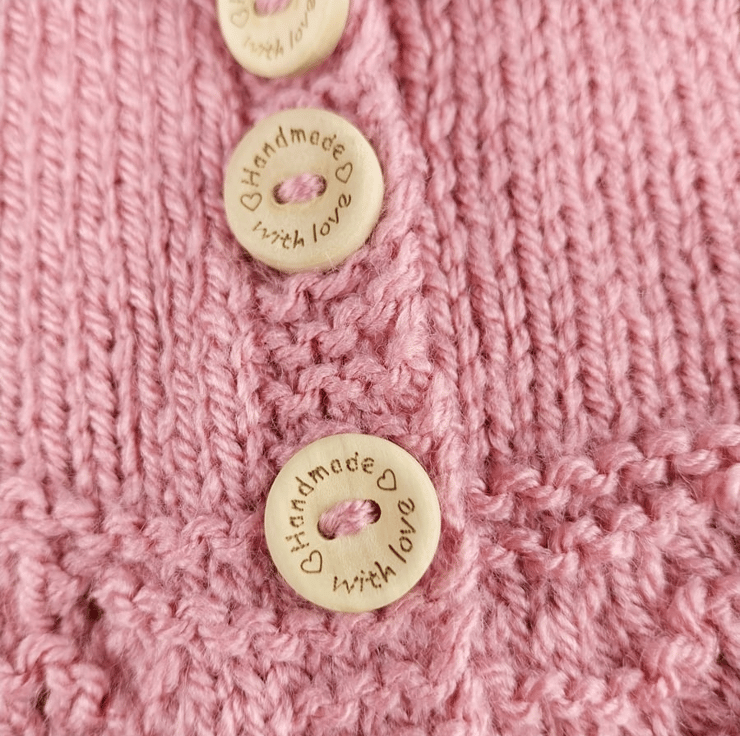 Adding to its charm, three wooden buttons grace the chest, each etched with the heartfelt words 'handmade with love,' imparting a personal touch to this delightful garment.