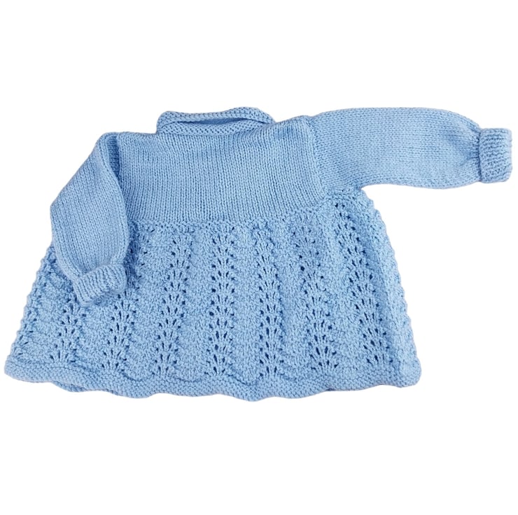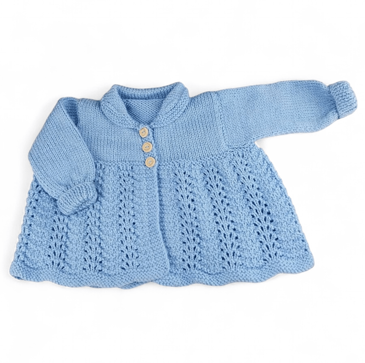 Experience vintage elegance with this Hand-Knitted Baby Cardigan, featuring a serene light blue hue and a classic lacy old shale pattern from Shetland.