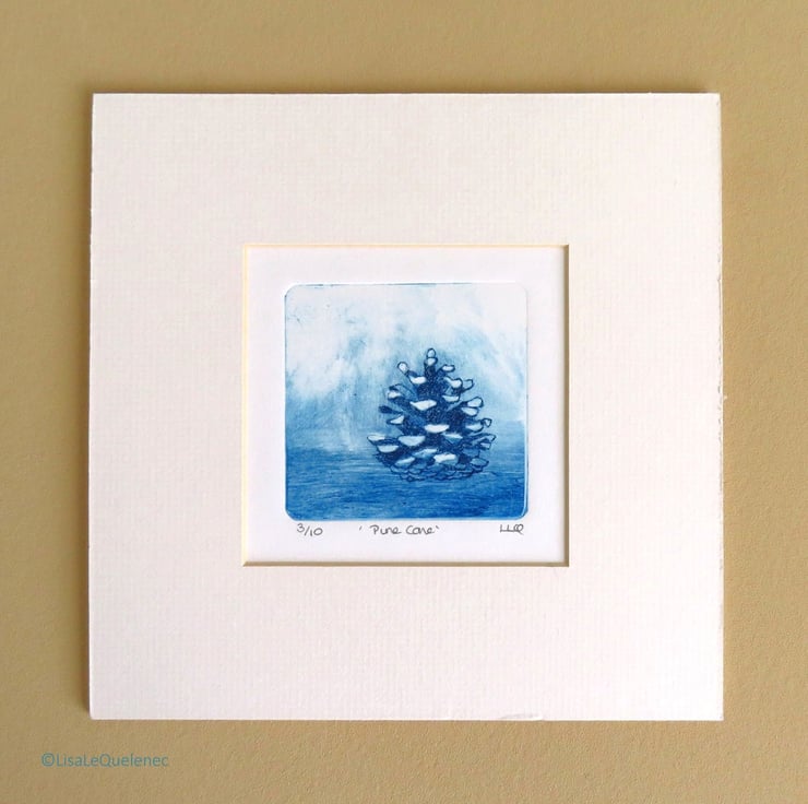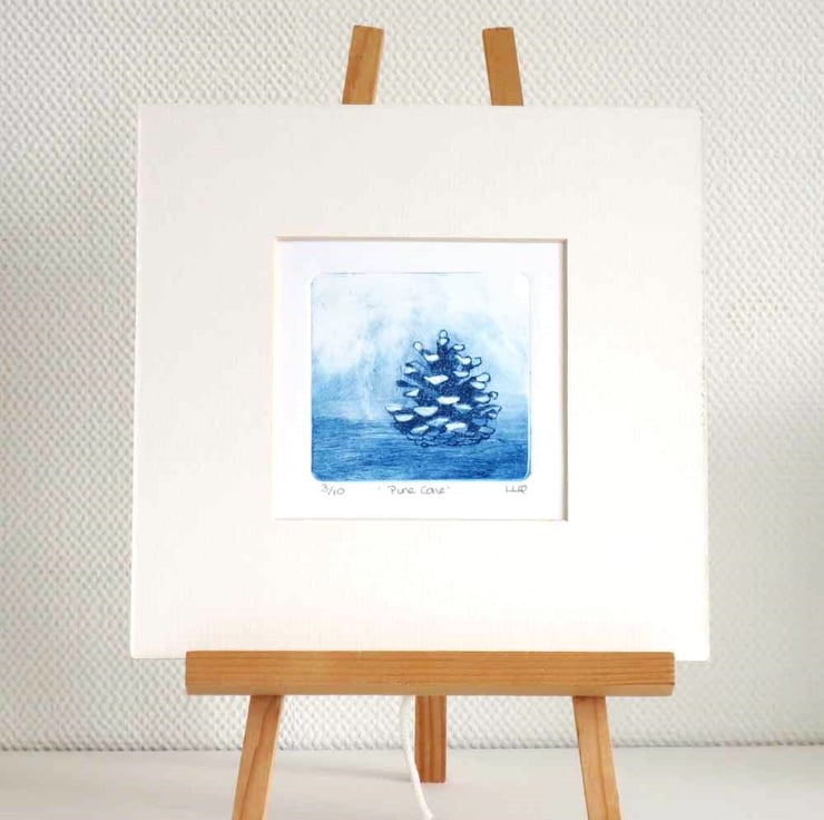 Original handmade drypoint etching print of a pine cone printed in blue ink. This print is no.3 of 10 in the edition (with three artist proofs). The image size is 8x7.5cm ( approx 2.75x3inch) and comes mounted/matted to fit a 20x20cm (approx10x10inch) frame.