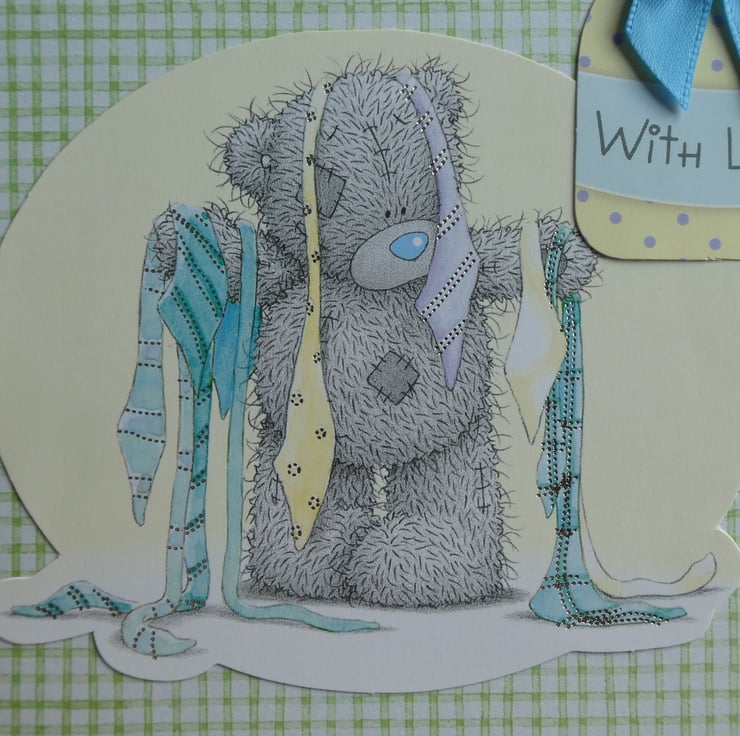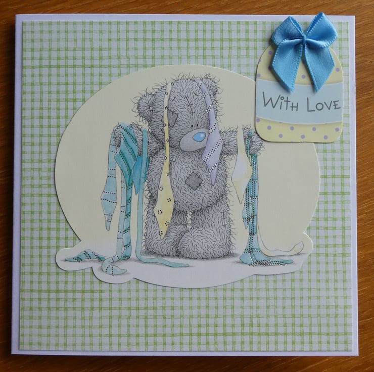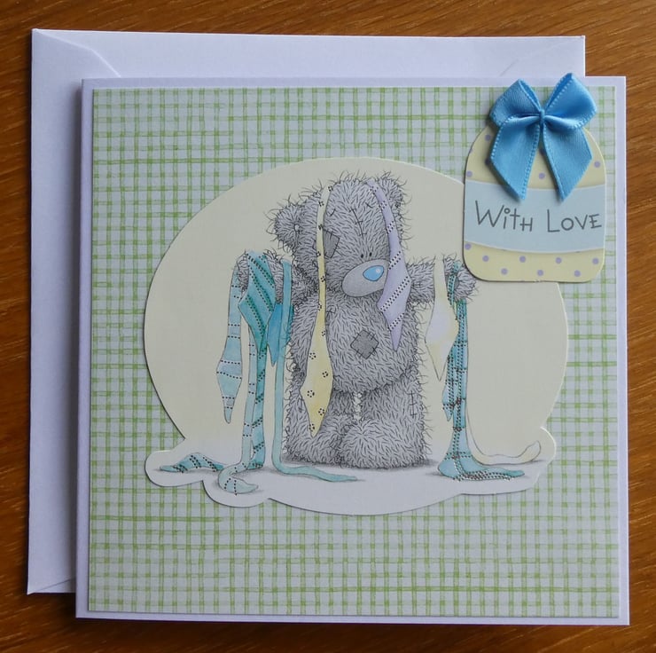 With the message With Love this cute Tatty Teddy card shows a teddy trying to choose from an array of ties. It could be sent for a birthday, Father's Day, new job or as a good luck card for a job interview.
