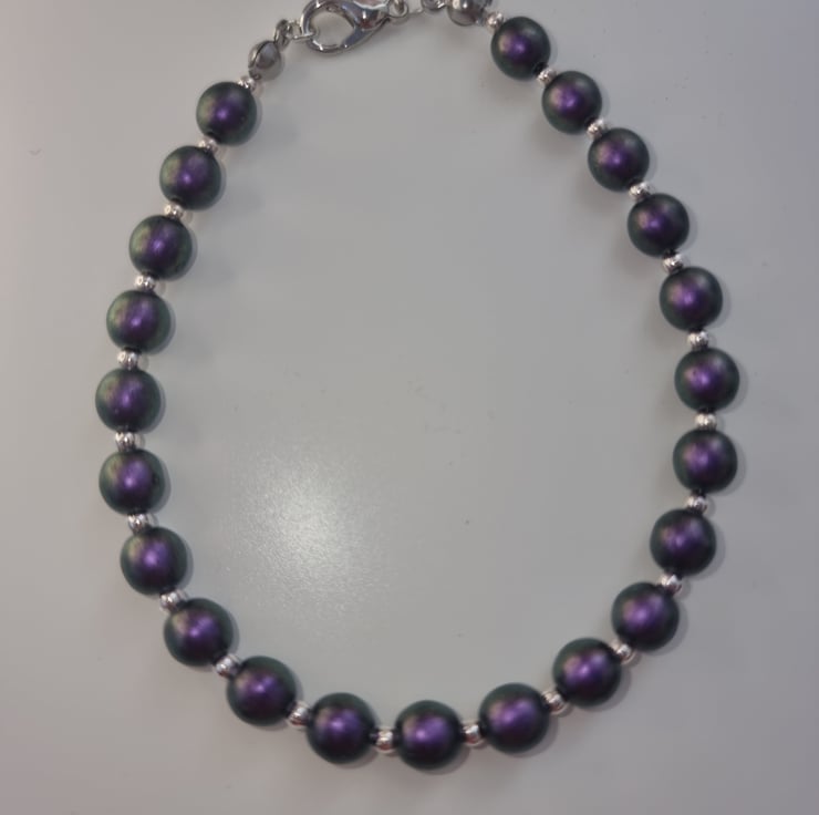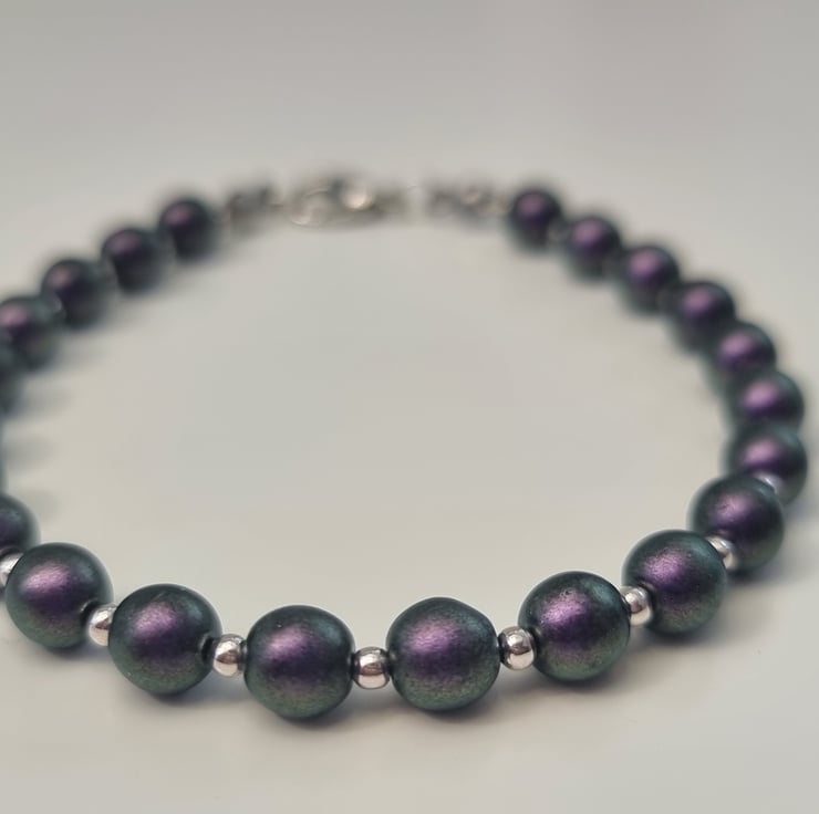 The bracelet has been made using Czech Glass Purple iridescent metallic beads with small sliver metal spacer beads. The beads are on a thin beading wire and it fastens using a silver clasp.