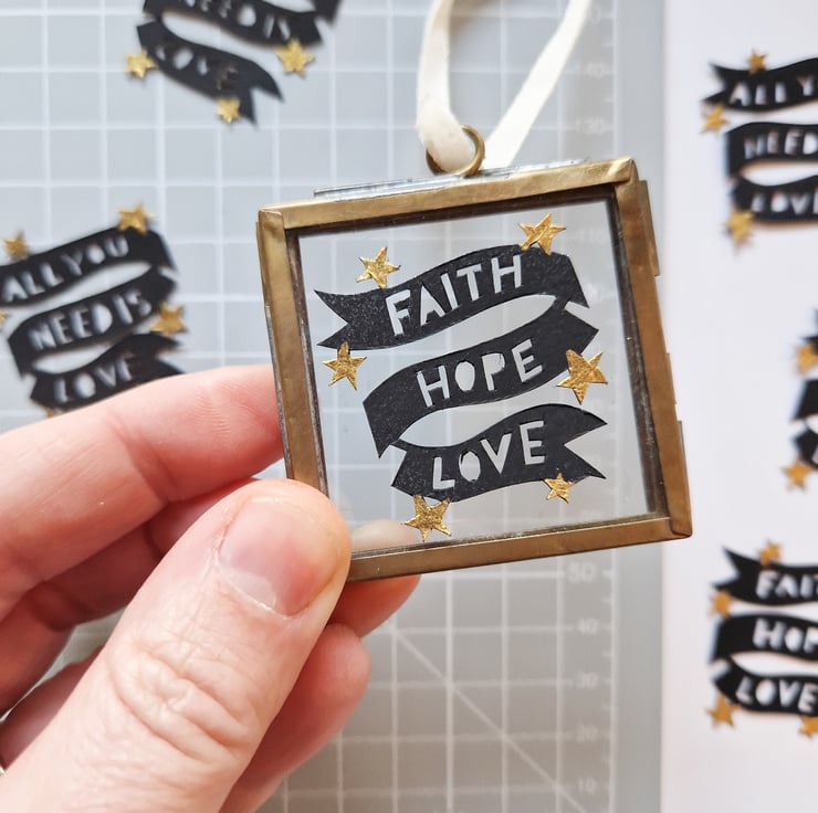 The papercut measures approximately 35x35mm and would fit beautifully in a 5x5cm double glass frame. (Suitable frames are currently widely available in stores such as Oliver Bonas, NOTHS and Amazon.)