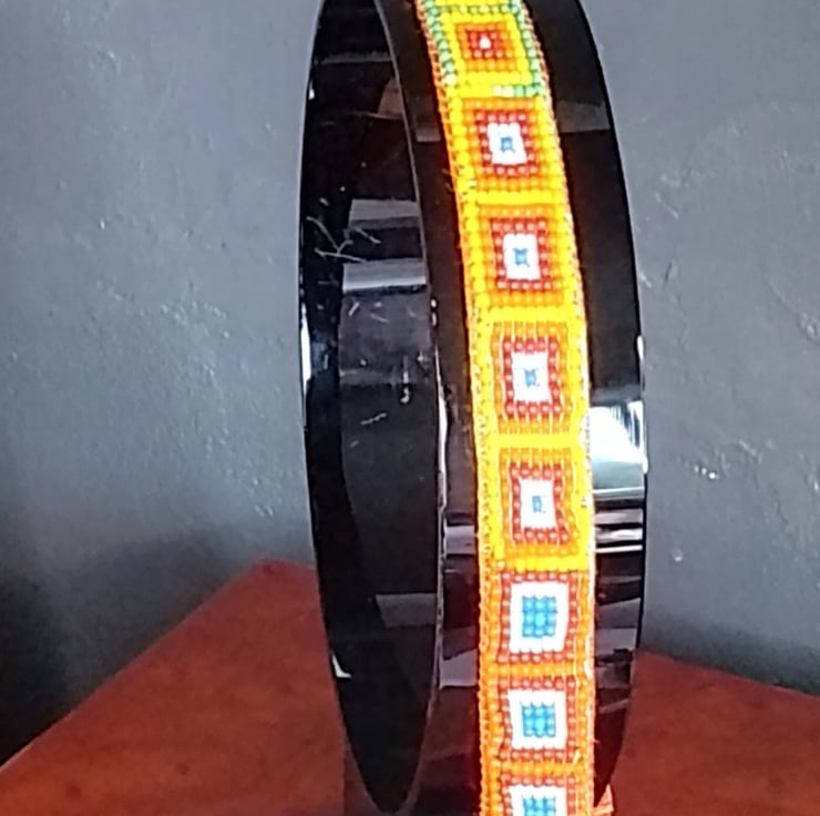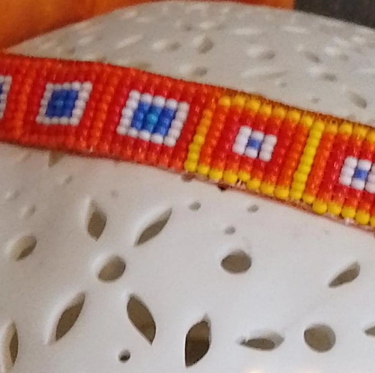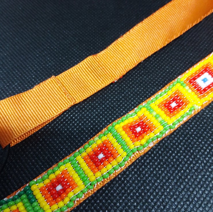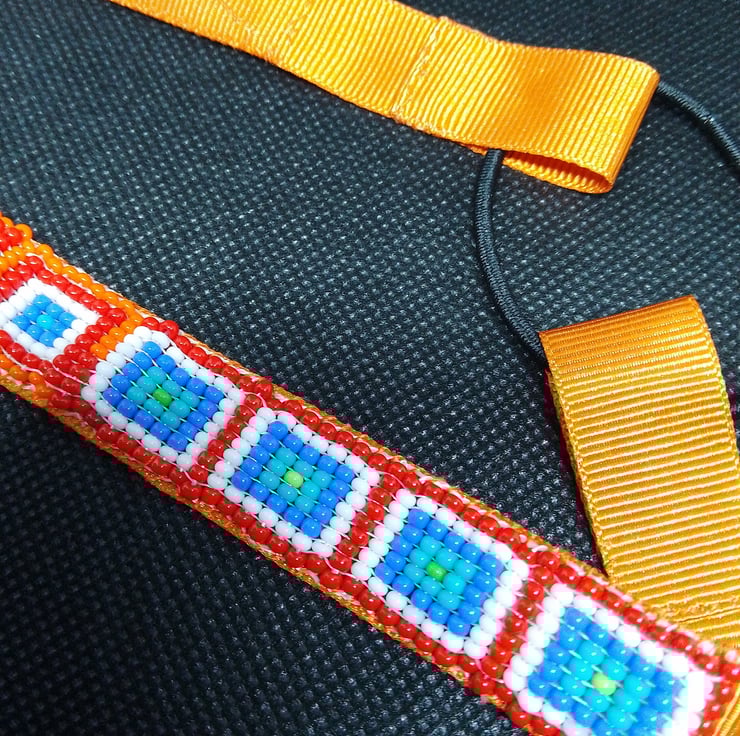 Bright multicoloured handmade beaded headband with pattern of squares, on an orange ribbon. Handstitched.