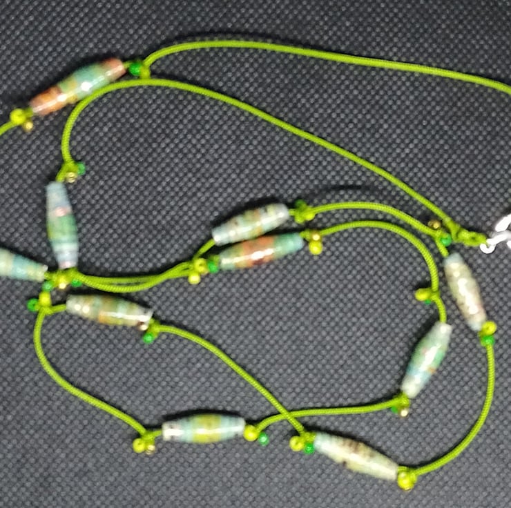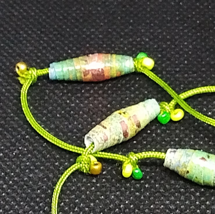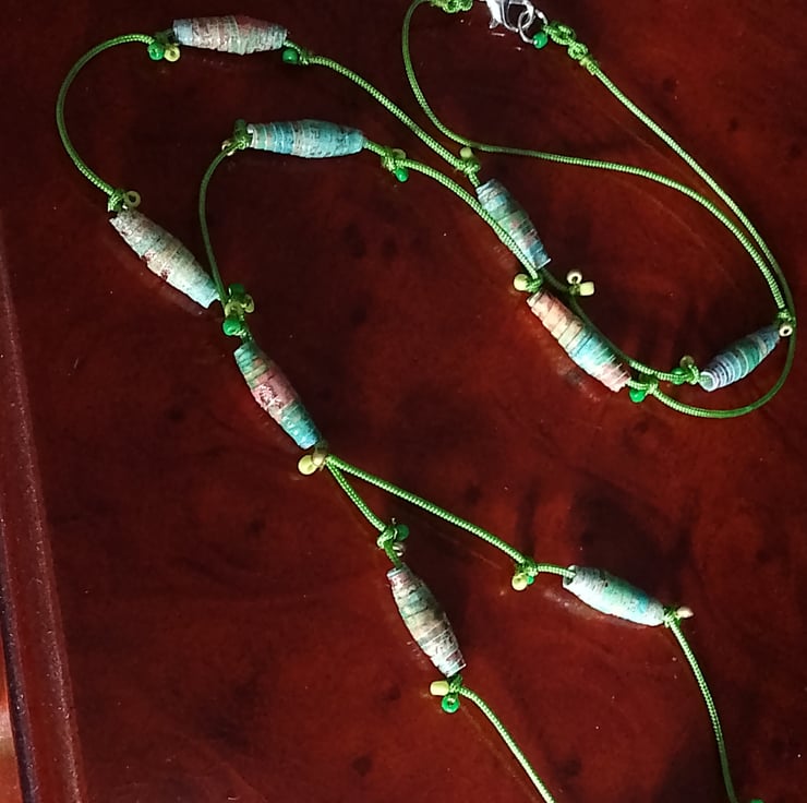 Handmade paper beads on knotted green cord, with seed beads sewn into the knots.
