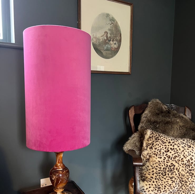 Extra tall lampshade in luxury plain hot pink velvet paired with a white lining