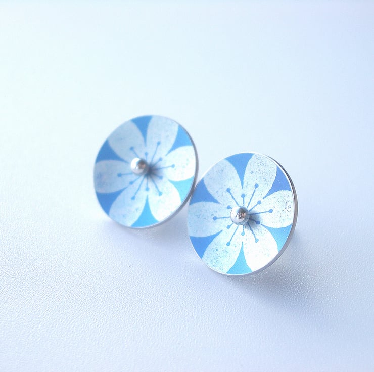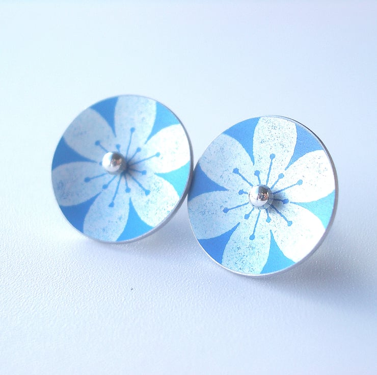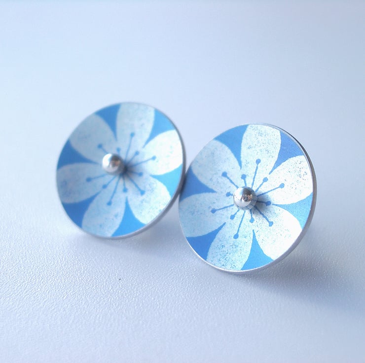 These sky blue and silver flower circle studs are made from aluminium which I have dyed and printed with a flower design. I seal in the dye which makes the colour a permanent part of the metal and the saw out the circle shape by hand, finally doming it inwards a little so that they catch the light when worn. Aluminium can't be soldered so the studs are loose. The circle is fed on to a sterling silver post which when worn holds the circle in place on the earlobe by pressure from the butterfly behind. The silver ball studs can be worn on their own too.