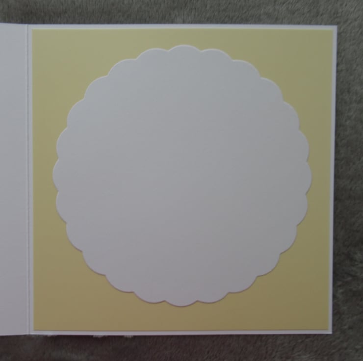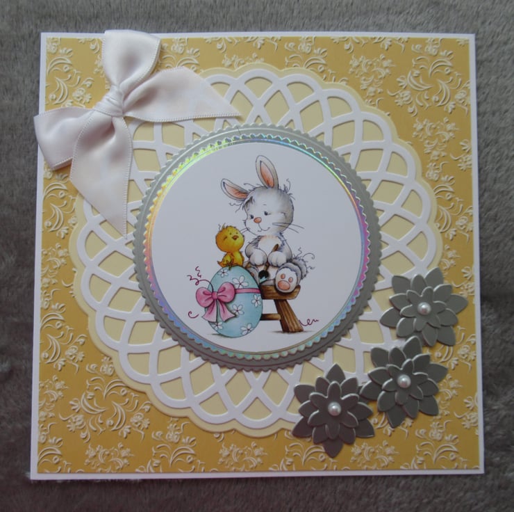 A pretty yellow card made using quality card stock. The image features a cute rabbit and chick sat beside a big Easter Egg and the image is placed upon 4 decorative mats which I have die cut from coordinating card. A white bow and hand made die cut flowers were added as embellishments. The inside has been finished to coordinate but has been left blank for your own message.