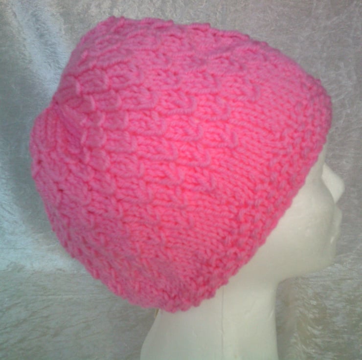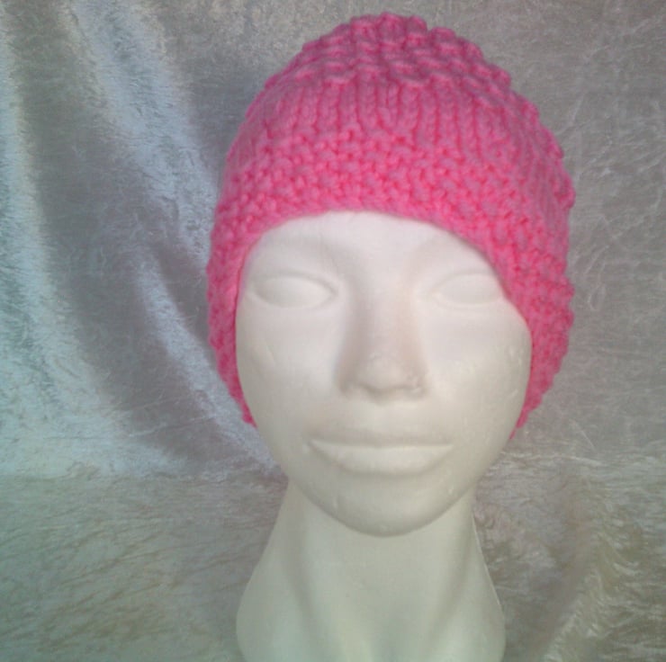 This hat has been hand knitted using Raspberry Pink chunky yarn with a moss stitch border and slip stitch design. It will keep your head warm on cold winter days.