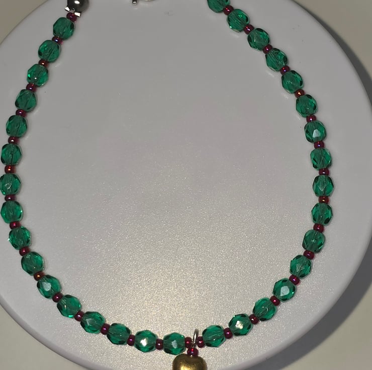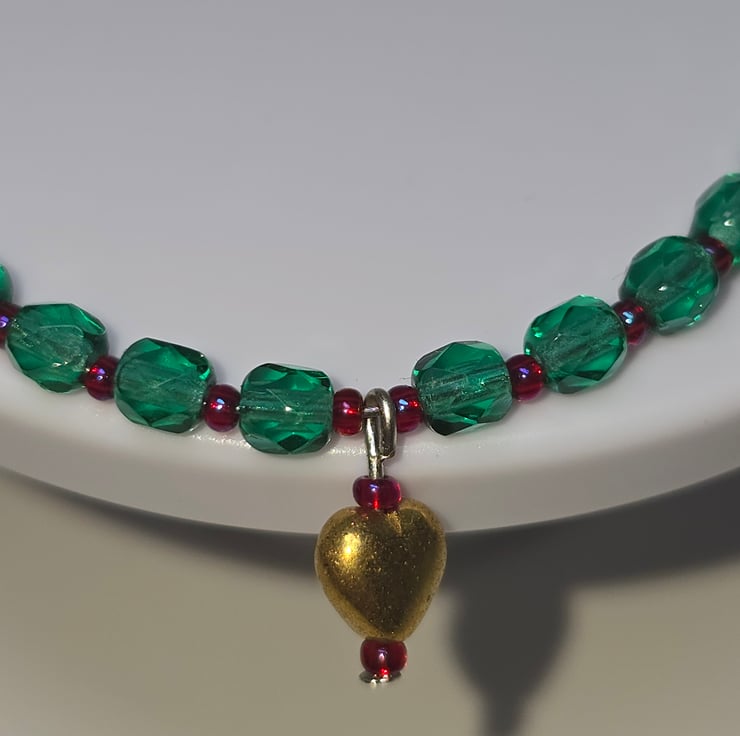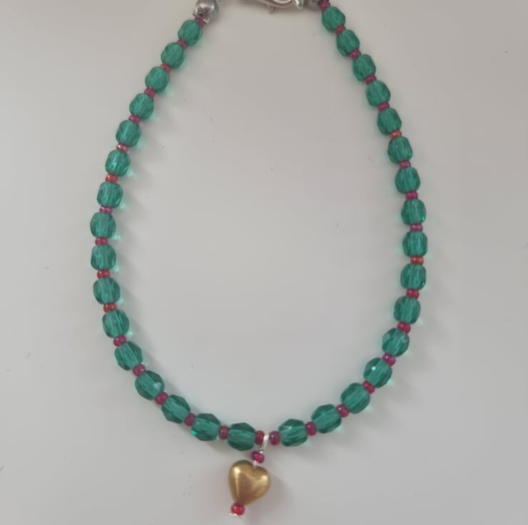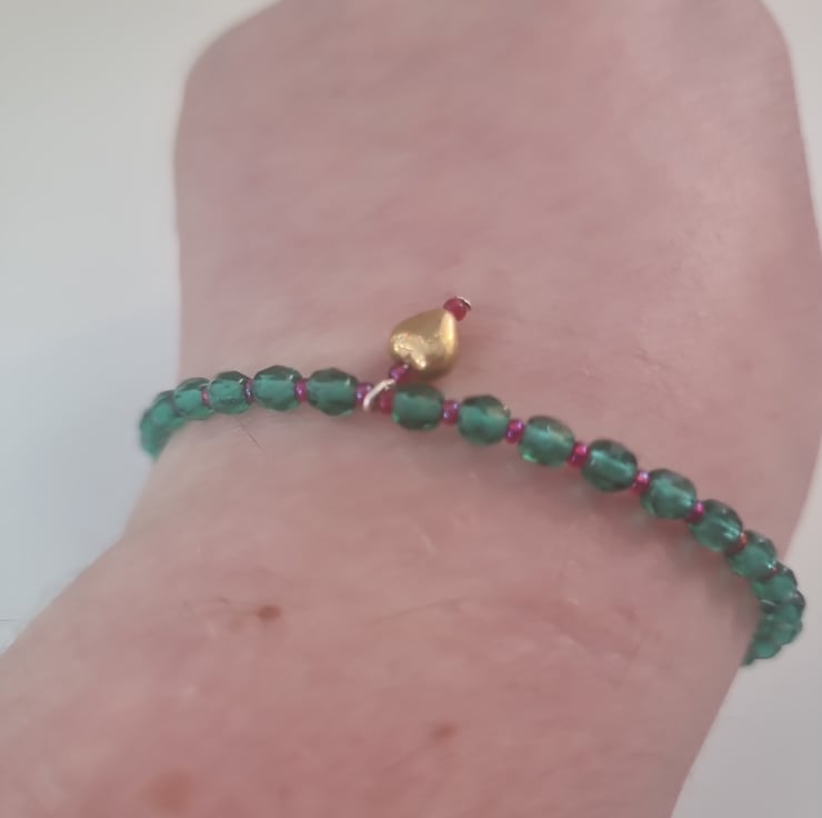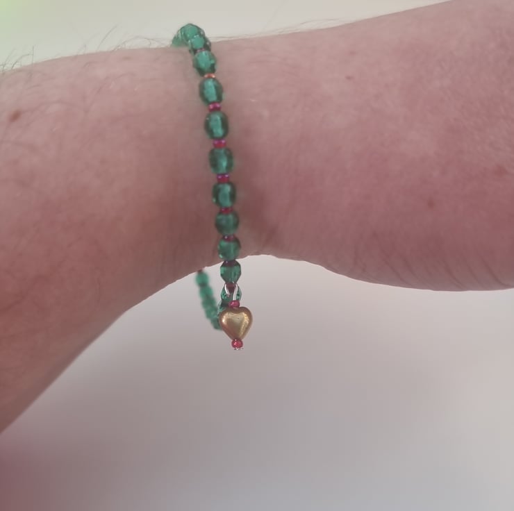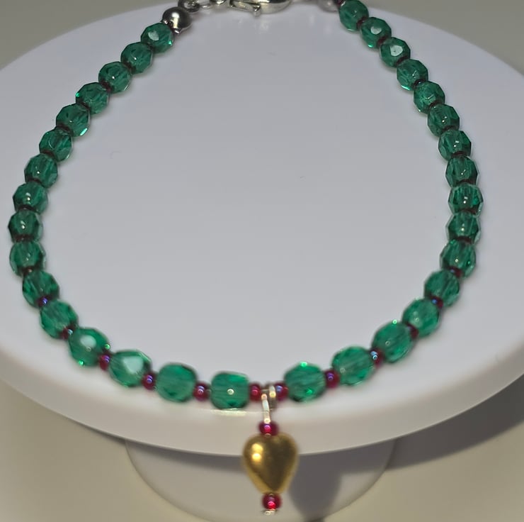 The bracelet has been made using 4mm czech glass green faceted beads with small red seed beads in between and a gold heart charm dangling from centre of the bracelet. The gold charm has small red seed beads above and below it. The beads are on a thin beading wire and fastens with a silver clasp.