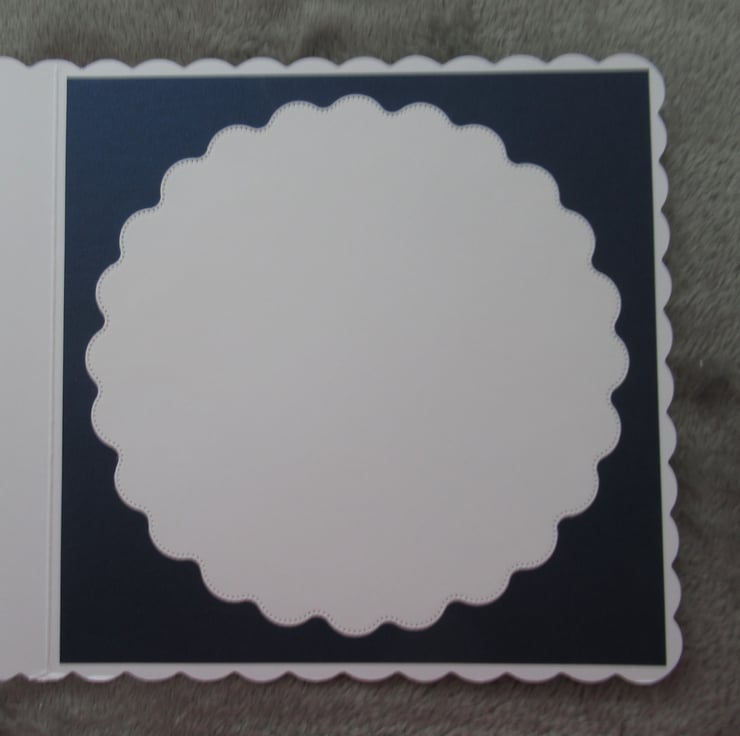 A pretty navy blue card made using quality card stock. The focus of the card is a decorative parasol which has been die cut from silver rainbow mirror card which changes colour as the light catches it. This is is placed upon 3 decorative mats which I have die cut from coordinating card. A thank you very much greeting was added and the inside has been finished to coordinate but has been left blank for your own message.
