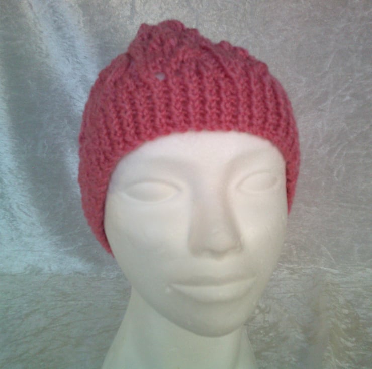 This hat has been hand knitted using double knitting acrylic yarn in a Dark rose pink, it has a lacy design and will keep your head warm on cold winter days.