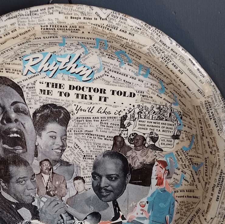 I was left a lot of my late uncle's collection of collections (as in, he had a lot of collections), and recycled one of the record catalogues into this collage.