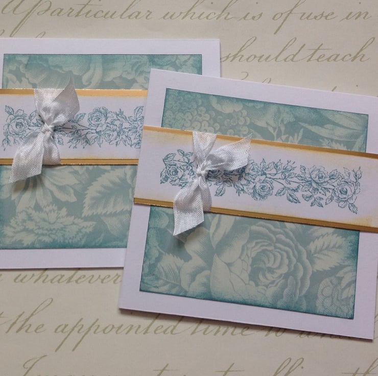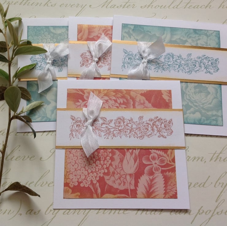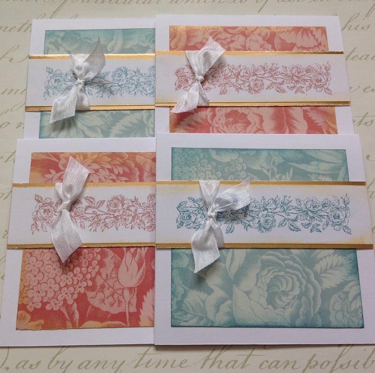 COLOURS; 2 x dark rose pink , 2 teal / blue .The base cardstock is bright white, with layers of pink or blue , then gold . Tied with vintage-style white ribbon.