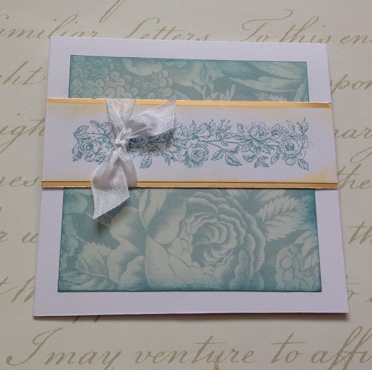 This is the ' Elegant Rose ' set. Comprising of 4 handcrafted , hand-stamped greetings cards (all the same elegant Rose design ) and tied with silky ribbon