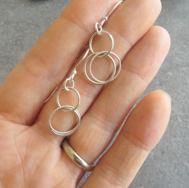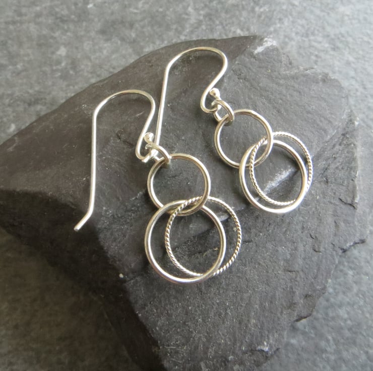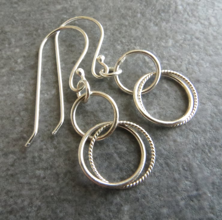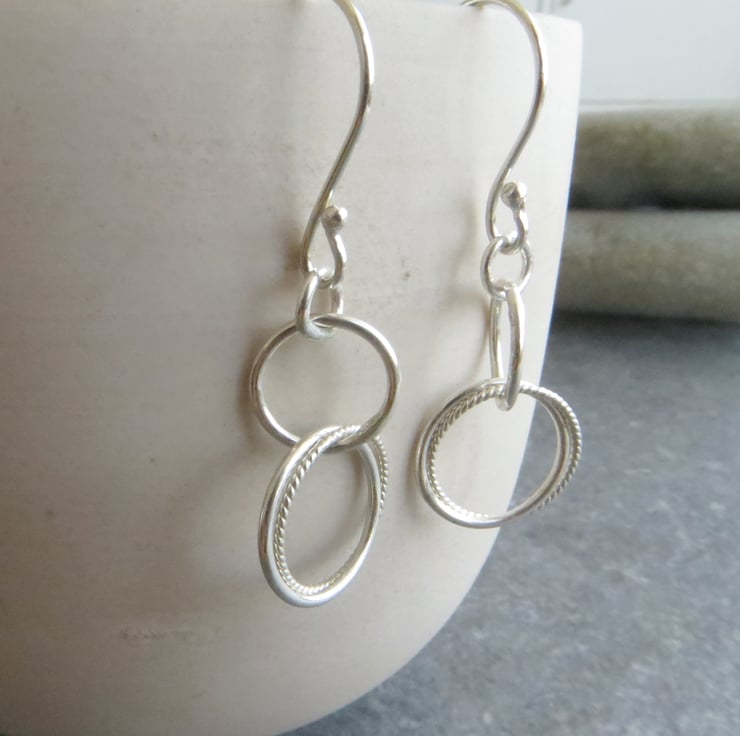 Dainty silver earrings made from two sizes of sterling silver rings, the larger pair are a twisted wire and smooth wire linked together; these hang from a slightly smaller ring. They're attached to handmade sterling ear wires and have a brightly polished finish.