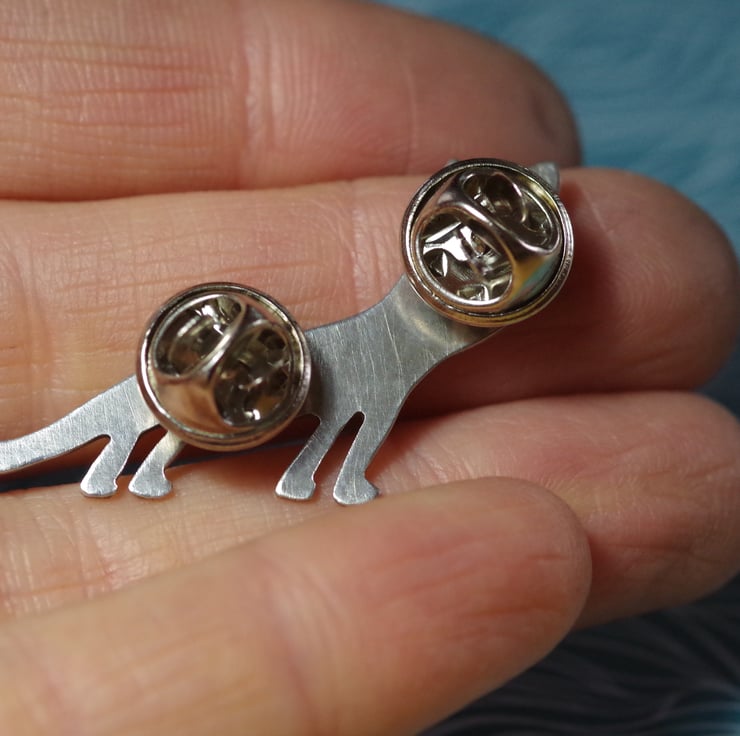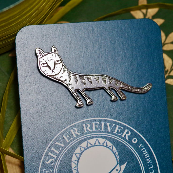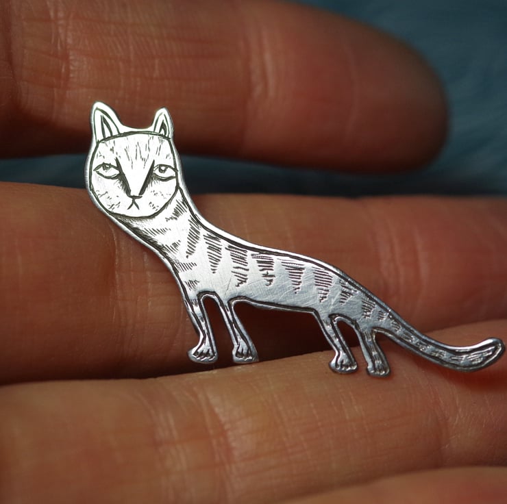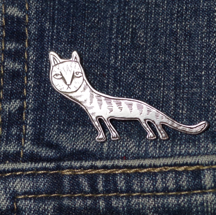 This cat pin is inspired by the many strangely ugly cats in medieval art. It has been hand cut from 100% recycled .925 Sterling silver sheet, soldered together using traditional silversmithing techniques, filed, polished, and carefully engraved. It has metal pins and butterfly clasps to close.