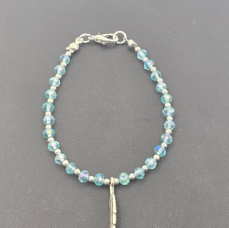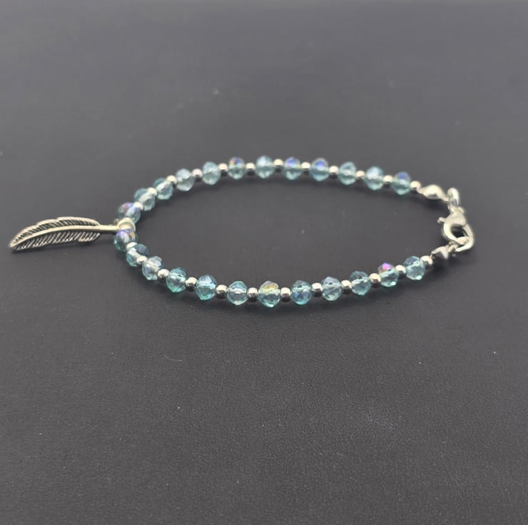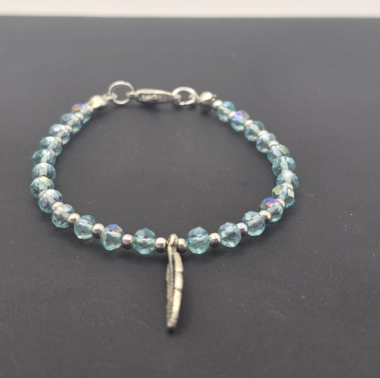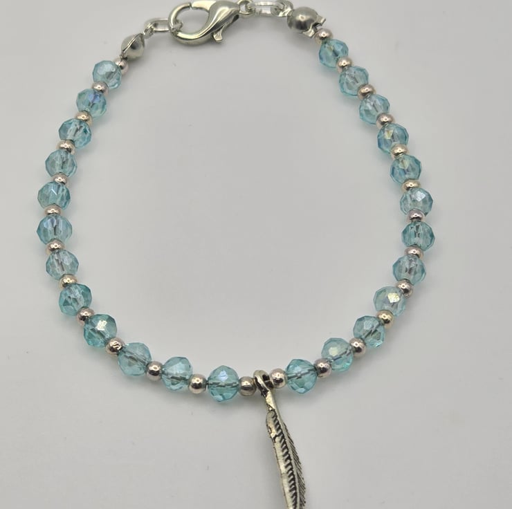 Kids Feather Charm bracelet. The bracelet has been made using small light blue fire polished beads with small silver metal spacer beads in between and a Silver metal feather bead in the centre of the bracelet. The beads are on a thin beading wire and fastens with a silver clasp