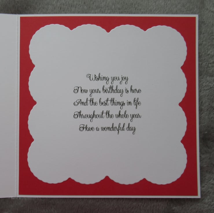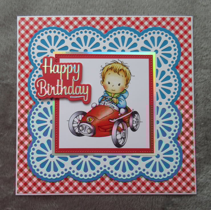A lovely red and bright blue card made using quality card stock. The focus of the card is the cute image of a little boy sat in his ride on red car. The image has been framed by a lovely square decorative die which has been cut from white card and placed upon a bright blue mat. This has been placed upon a bright red gingham background card. A Happy Birthday greeting has been added and the inside of the card has been finished to coordinate with a verse as pictured. The greeting has been raised with 3d foam.