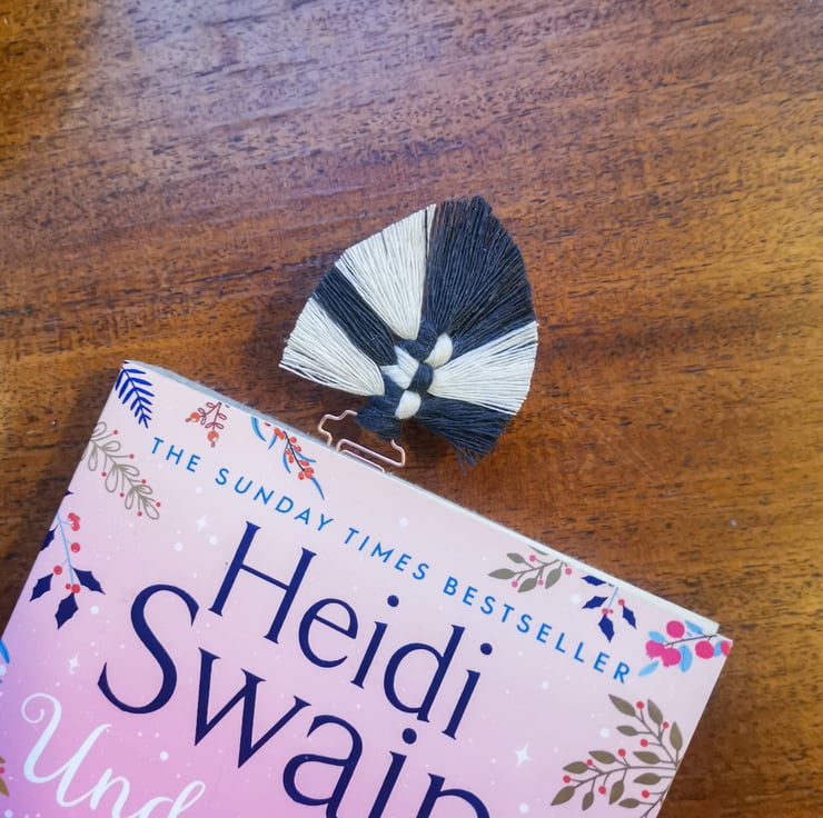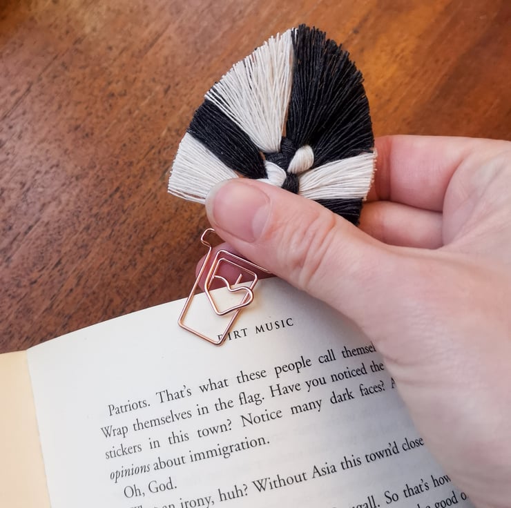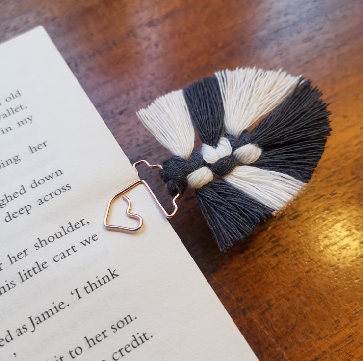 This macrame paperclip slides easily onto the pages of your book and stays put, so you never lose your place.