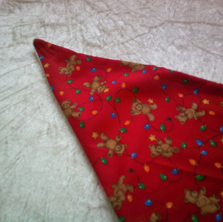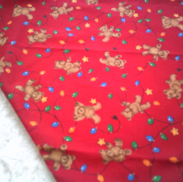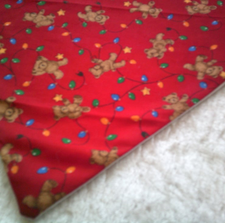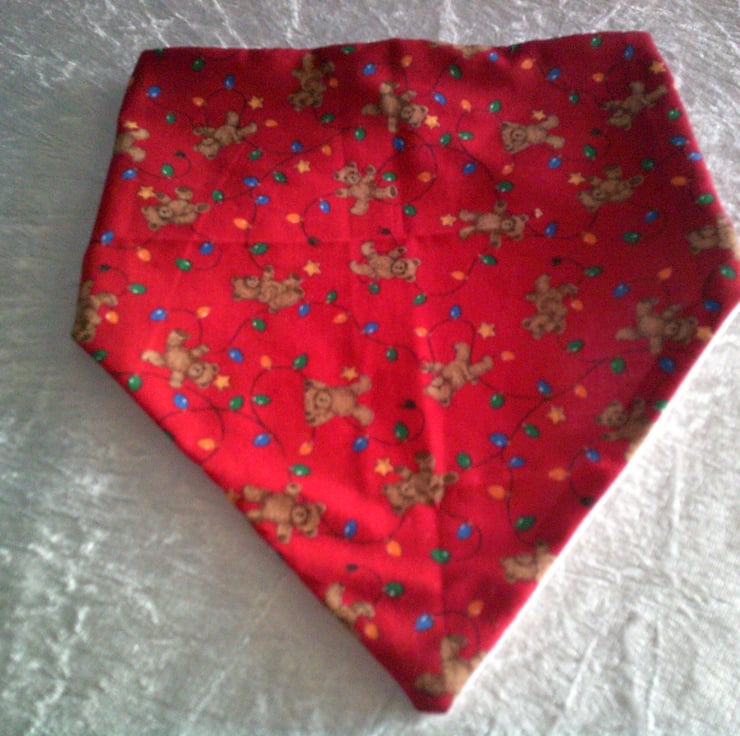 The fabric used for this dribble bib is of Teddy Bears and Fairy Lights on a red background.