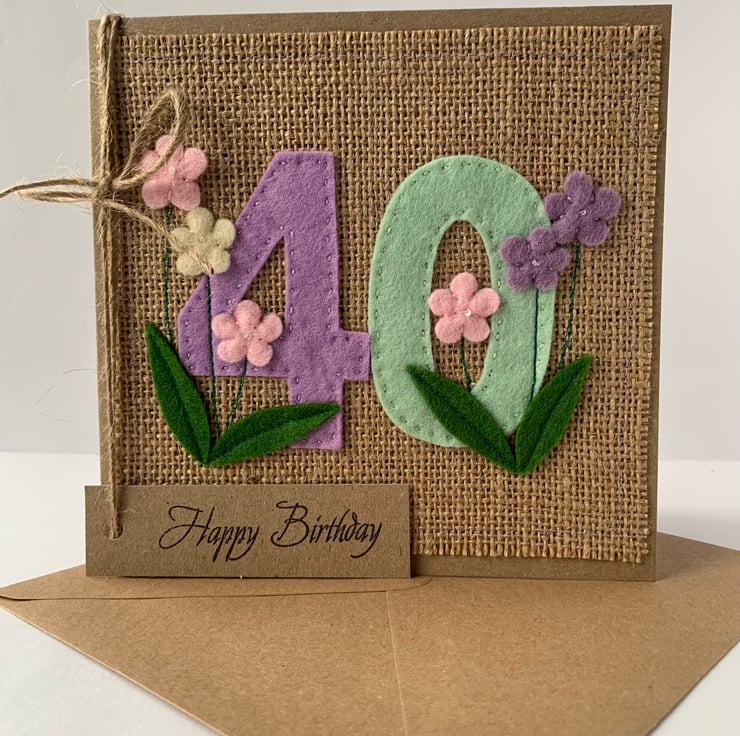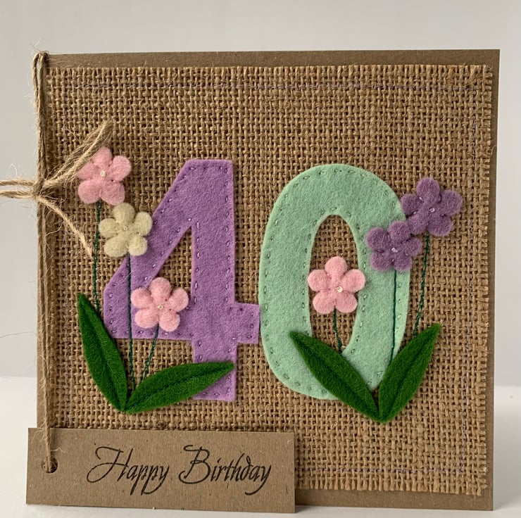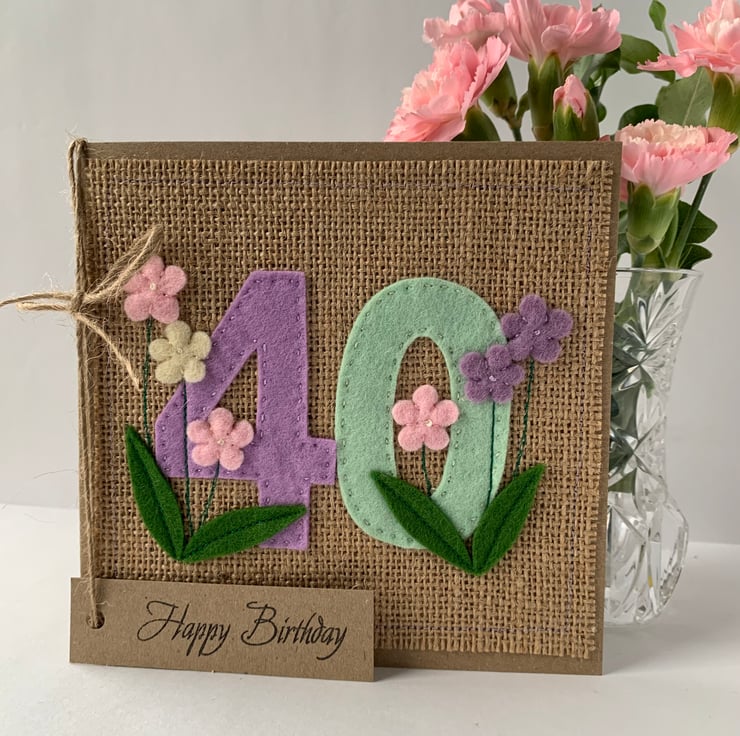 A unique handmade card for a special birthday. The numbers for this 40th birthday are hand cut from mint green and lilac acrylic felt and hand sewn to a hessian background. Flowers, hand cut from wool felt, in cream, pinks and purples are added to decorate the card.
