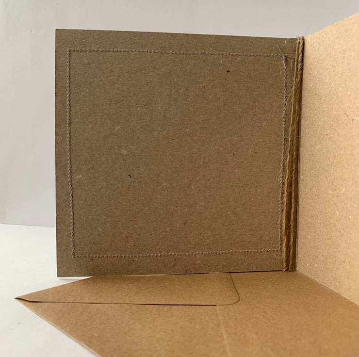 The hessian is machine stitched, using a contrasting thread, onto a plain brown recycled card. This stitching is visible on the inside of the card.