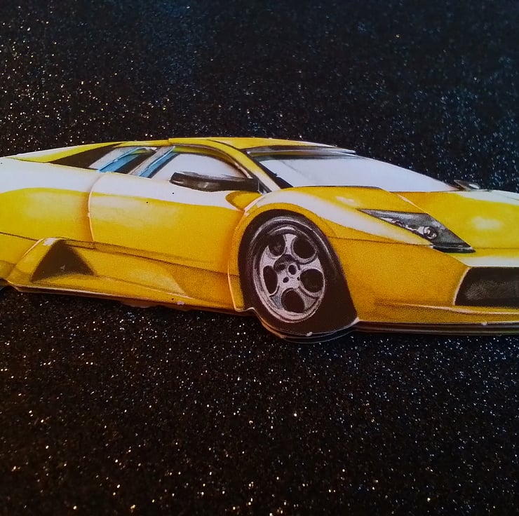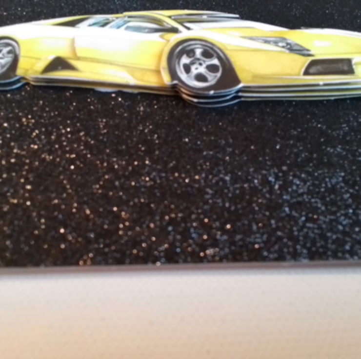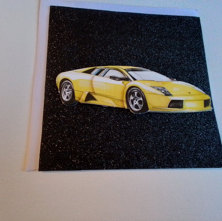 Card for any occasion with a yellow sports car on a sparkly black background.