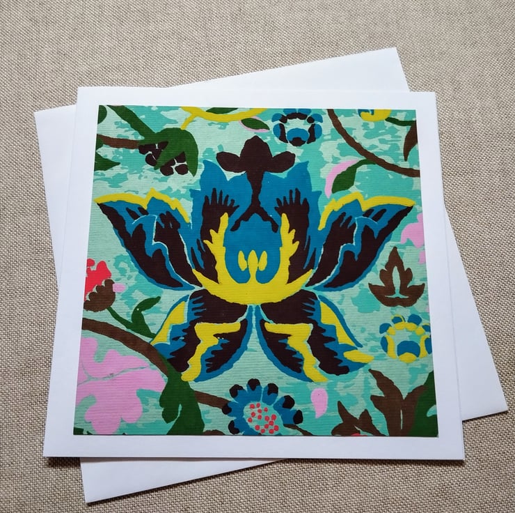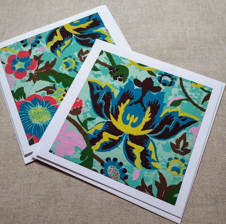 These colourful cards are made using flocked paper, this gives a little texture adding interest. They are blank inside so can be used for many occasions. Each card measures 14.5x14.5cm and have white envelopes.