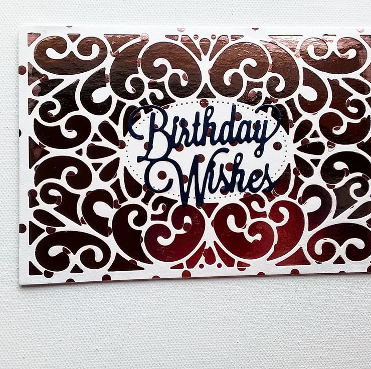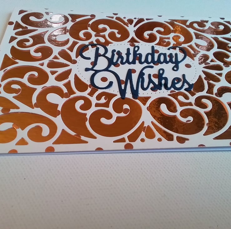 A pretty Birthday card which is in gold and cream with a navy blue greeting.