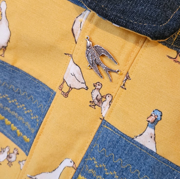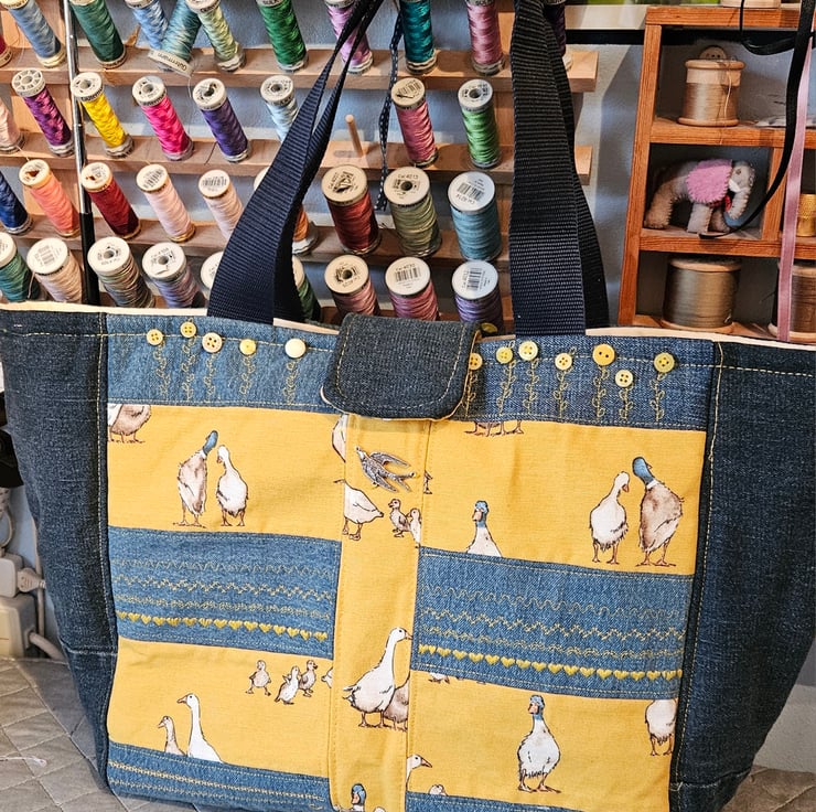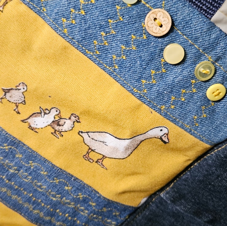 This denim tote bag is made from old jeans and upholstery offcuts. It has shoulder straps, is fully lined with internal pockets. I love this little duck fabric, so bright. The bag is decorated with machine embroidery and little yellow button flowers. The bag has a tab with magnetic button closure, It measures 14" along the bottom and approx. 20" at the top with a gusset so very roomy. This bag is my proto-type so the price reflects this. The normal retail price will be £40, this one available for £20 inc. P&P. Add your own personal touches with badges and charms.