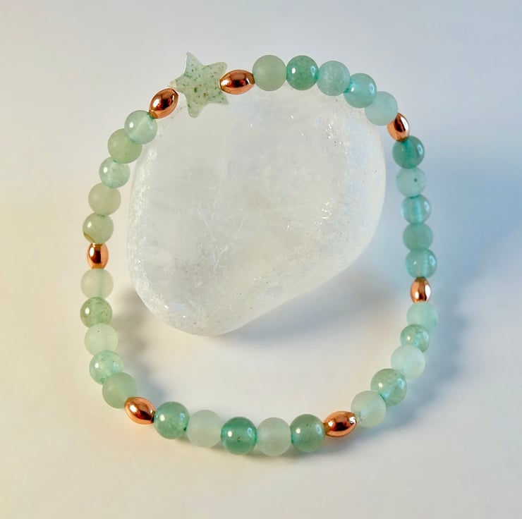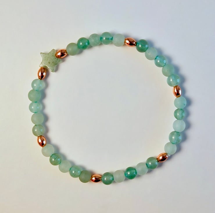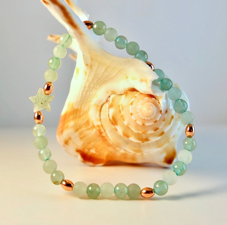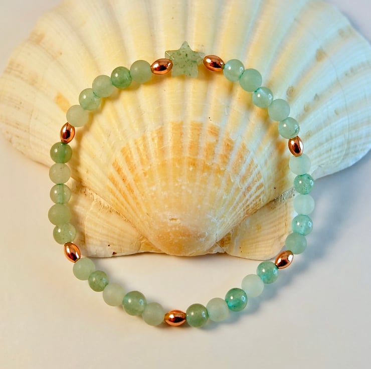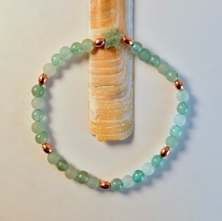Pretty, dainty bracelet featuring a 9mm Green Aventurine star set between 4mm beads of smooth and frosted green Aventurine and 5mm pure copper oval beads