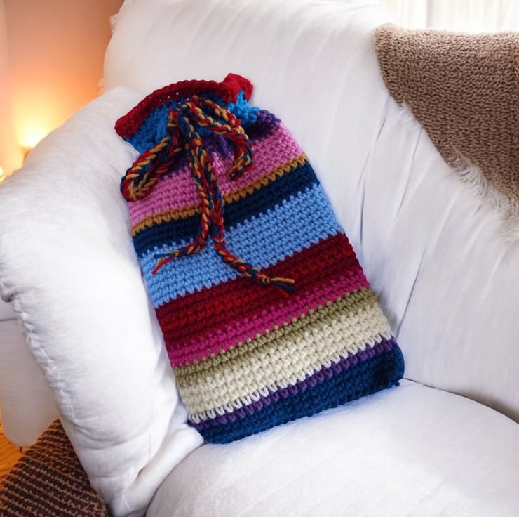 This hand-crocheted hot water bottle cover isn’t just practical—it’s a vibrant, snuggly hug for those chilly nights. Made with love (and a dash of personality!), it features bold stripes of cheerful colours that brighten any bedroom.