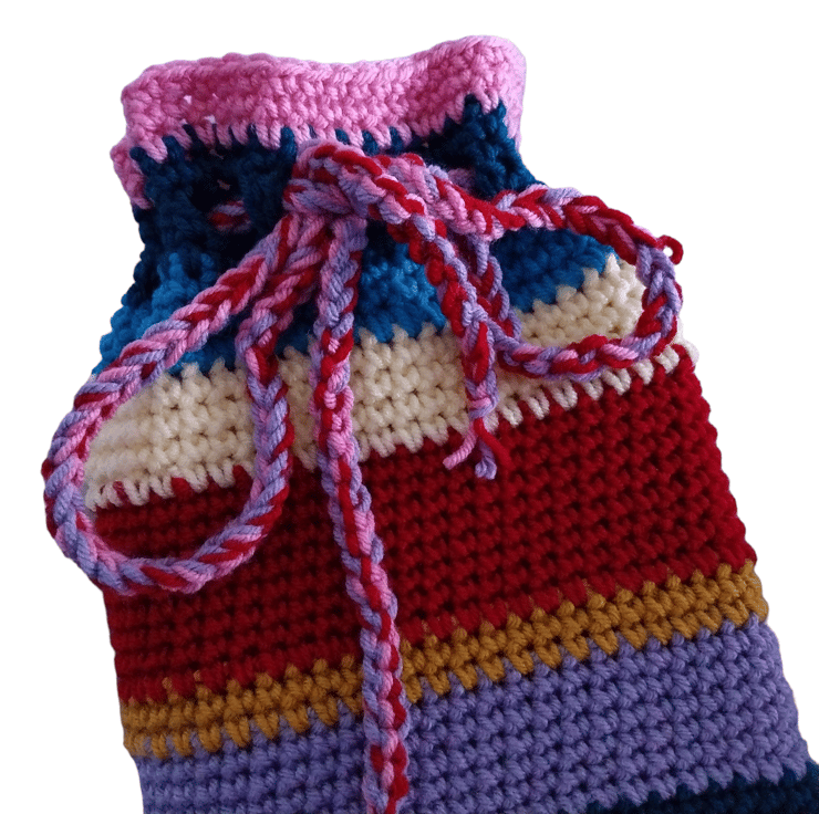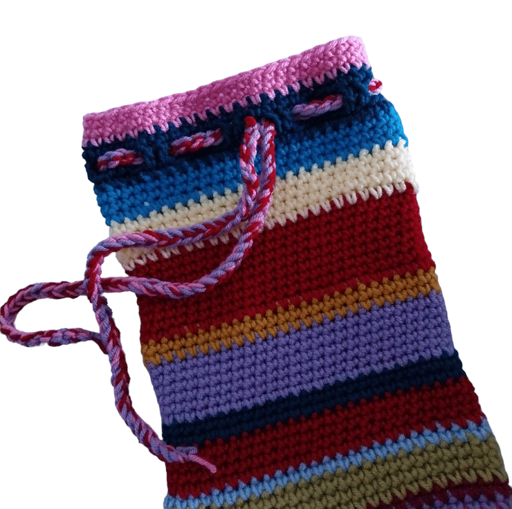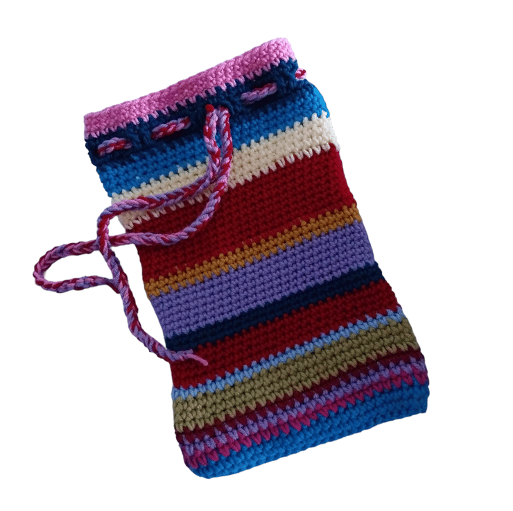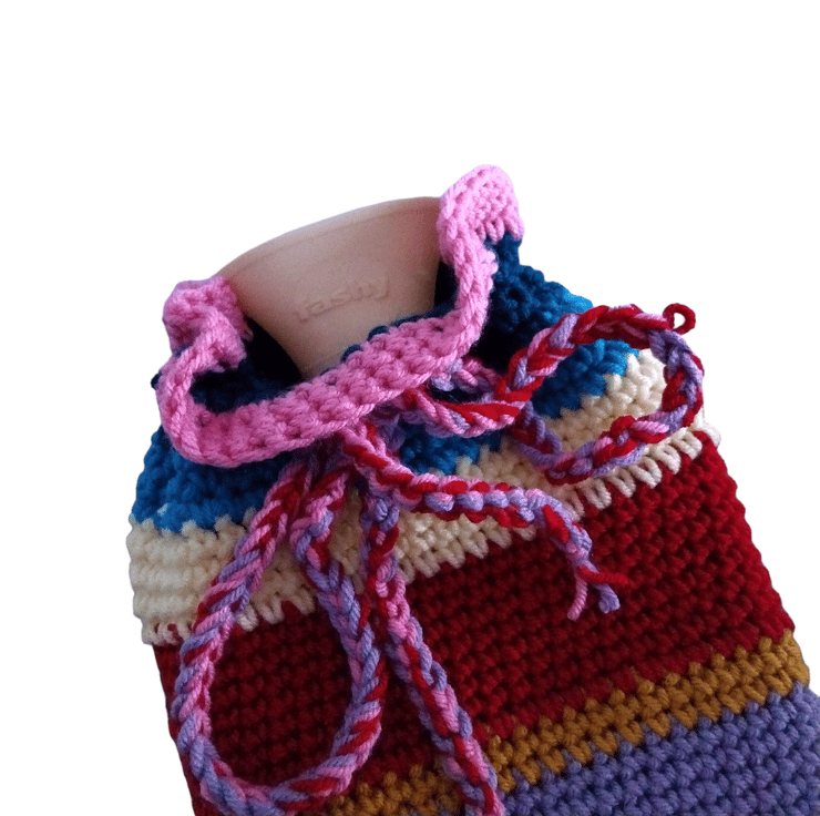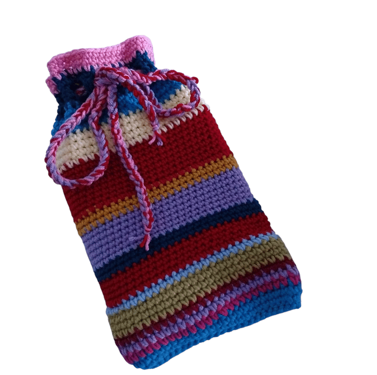 Crocheted Hot Water Bottle Cover, a vibrant and cosy addition to your home essentials. Featuring random stripes of lively colors, including reds, pinks, blues, greens, and yellows, this cover adds a cheerful touch to any room.