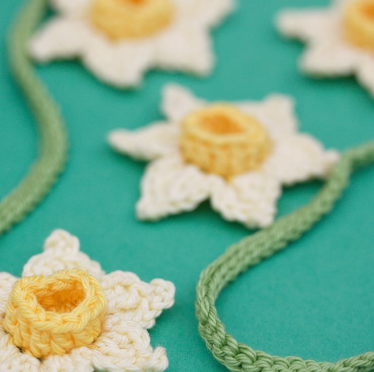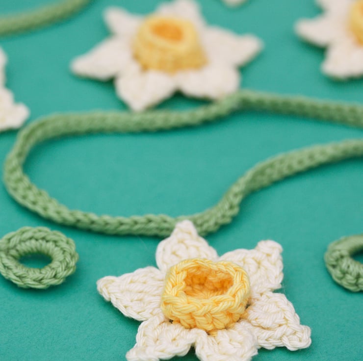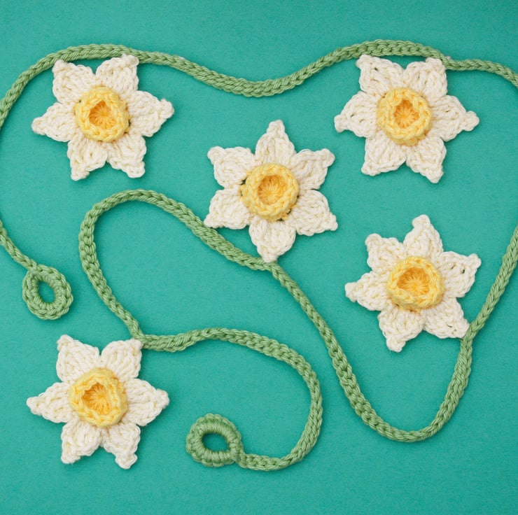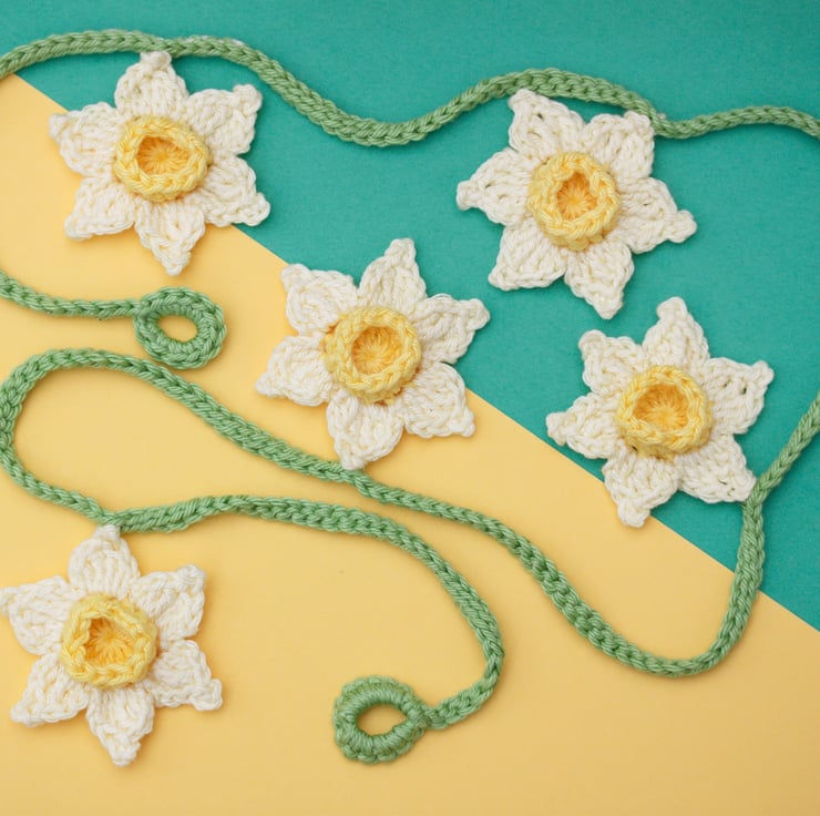Crochet Easter Daffodil Garland is approximately 90cm / 3 feet long. There are 5 daffodil flowers with each one approximately 50mm / 2 inches wide.
