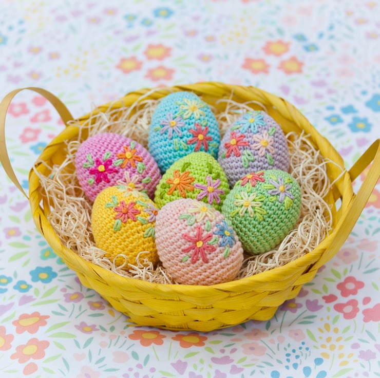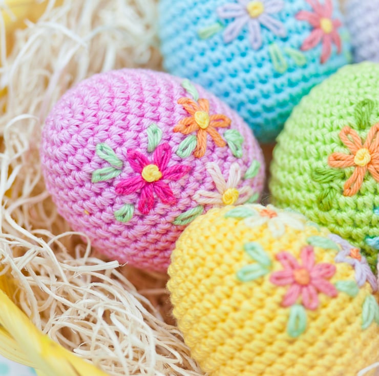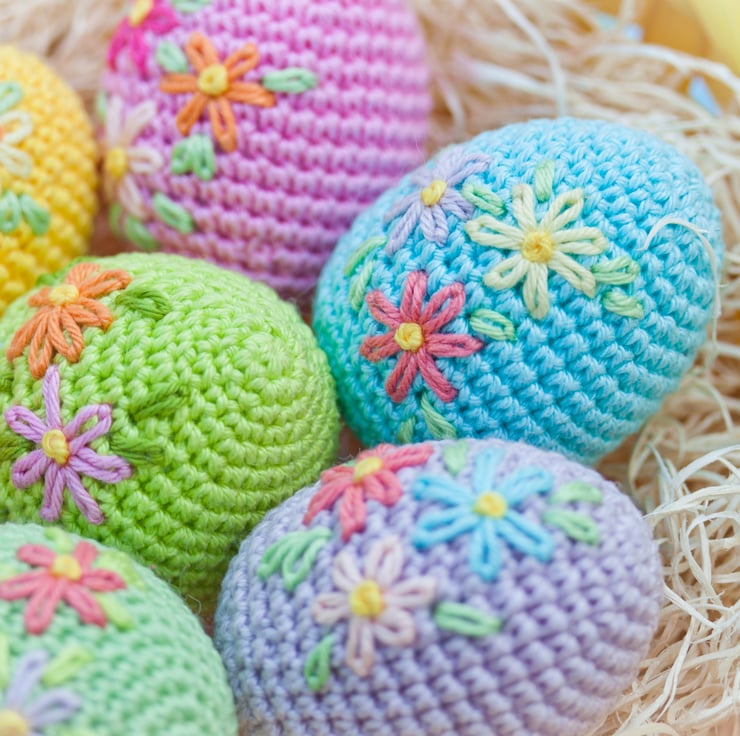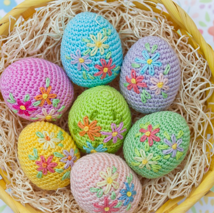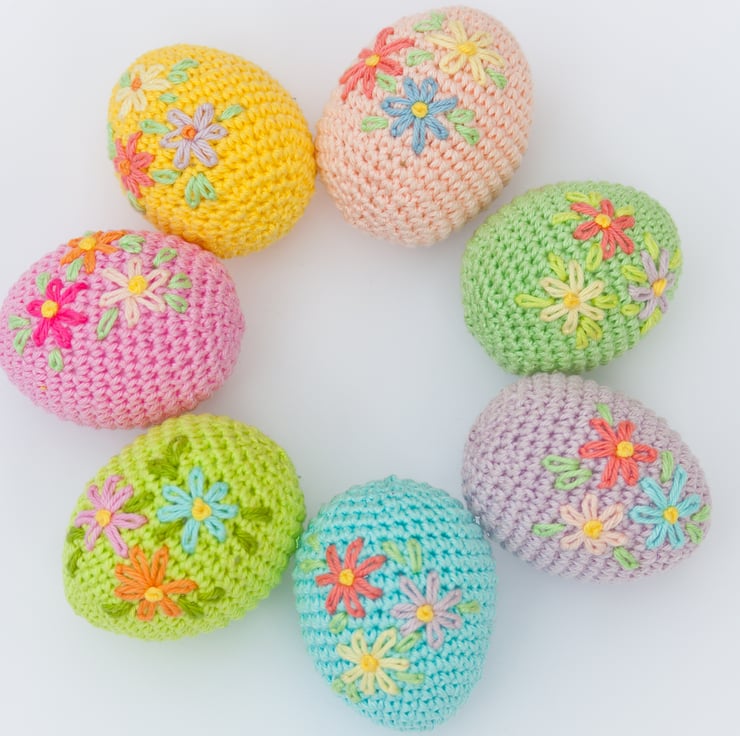 Crochet Easter Eggs with embroidered flowers.