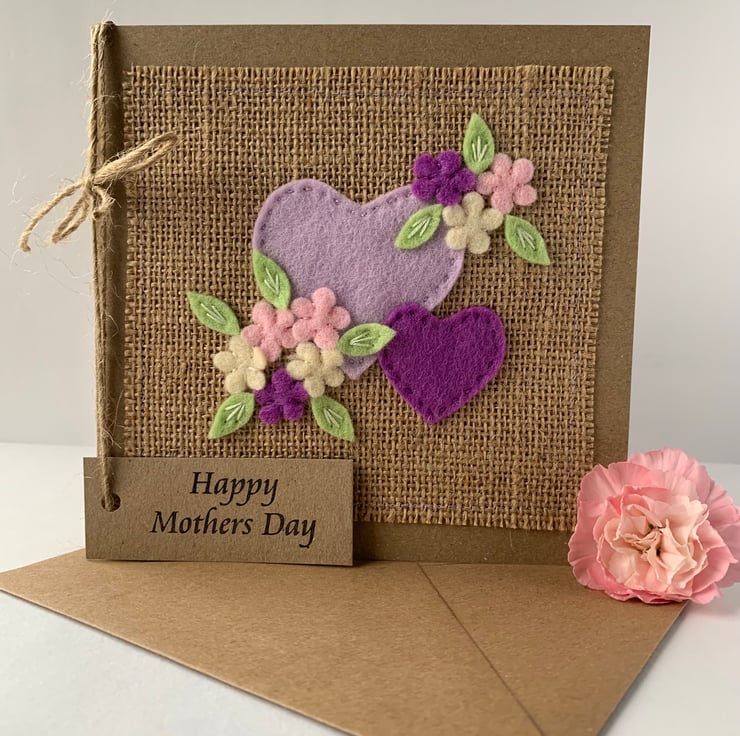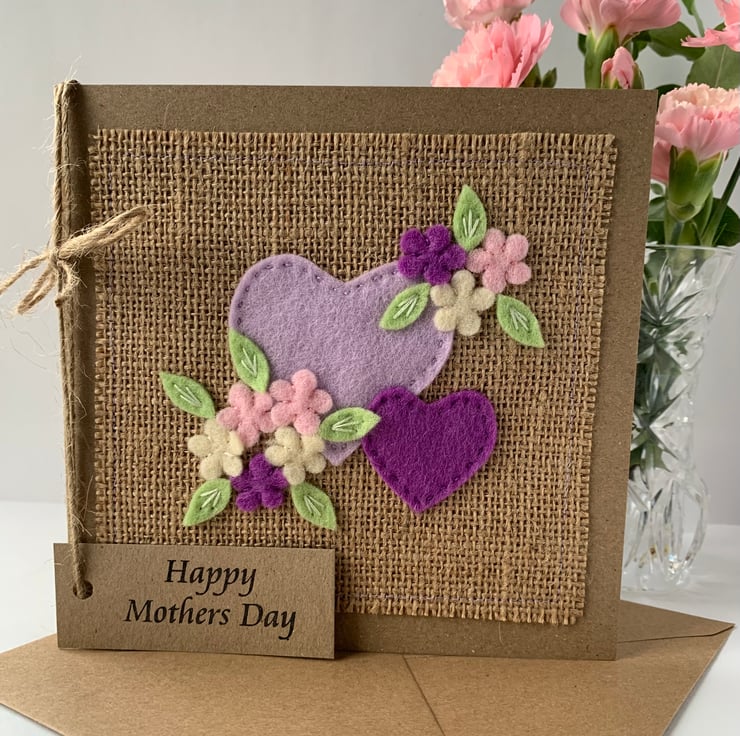 A handmade Mother’s Day card decorated with hearts in lilac and purple and delicate flowers in pale pink, purple and cream.
