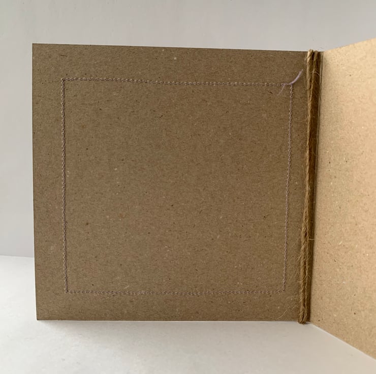 The hessian is machine stitched using a contrasting thread, onto a plain brown recycled card. This stitching is visible on the inside of the card.