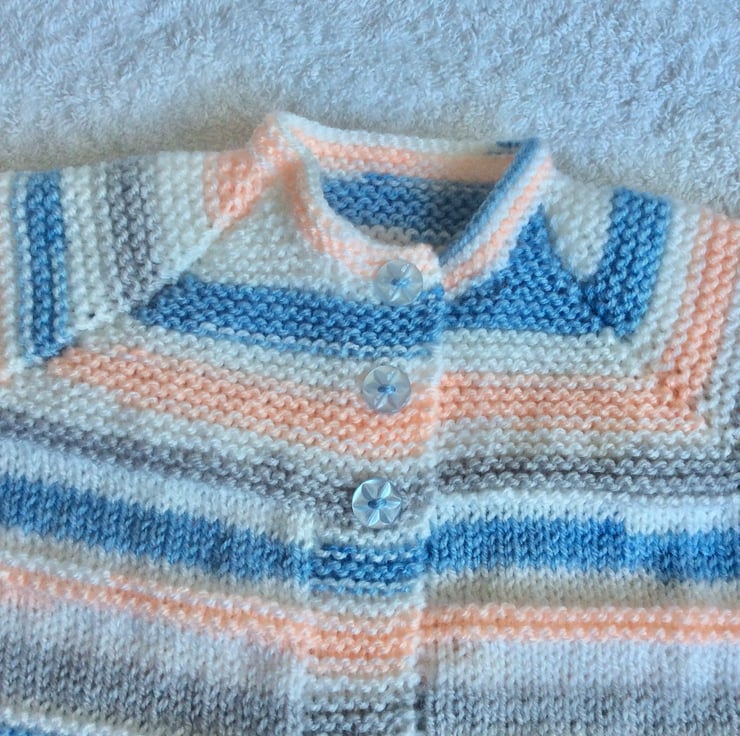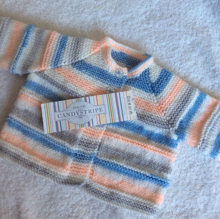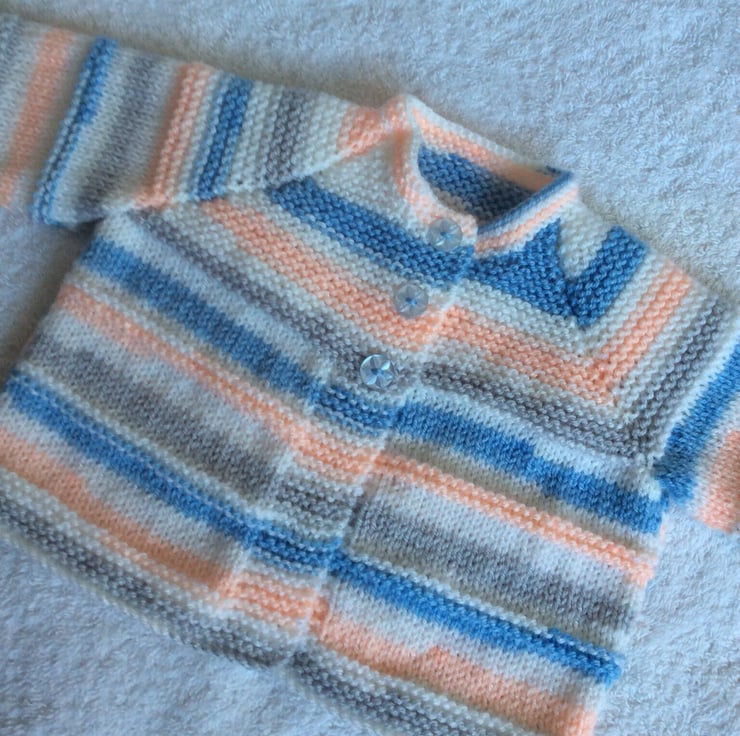 Hand knitted baby cardigan made by me in my Suffolk home. I have used a good quality easy care baby yarn in a very attractive self striping shade. This is one of my favourite vintage patterns to knit, it is so versatile and easy for a little one to wear. Would make a very welcome new baby gift too. Knitted to fit a baby from birth to three months approximately.